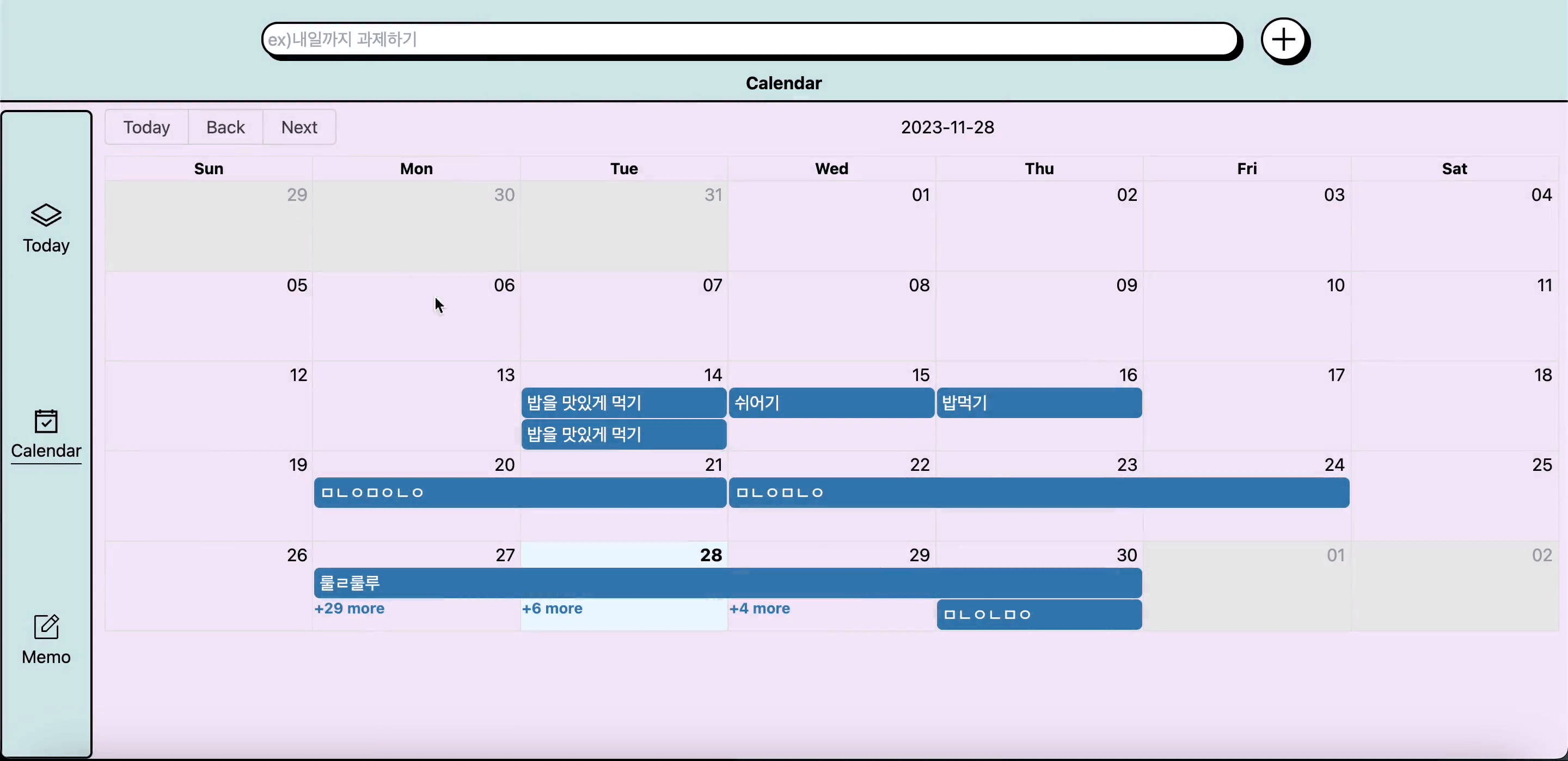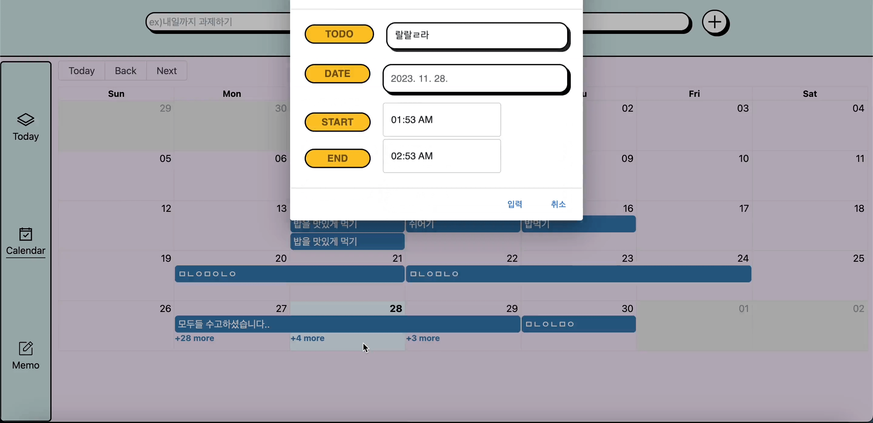 캘린더 페이지에서 일정을 생성, 입력, 삭제 할 수 있습니다. 그리고 ‘오늘’에 해당하는 일정과 기간이 ‘오늘’에 걸쳐진 일정을 Today 페이지에서 볼 수 있습니다.