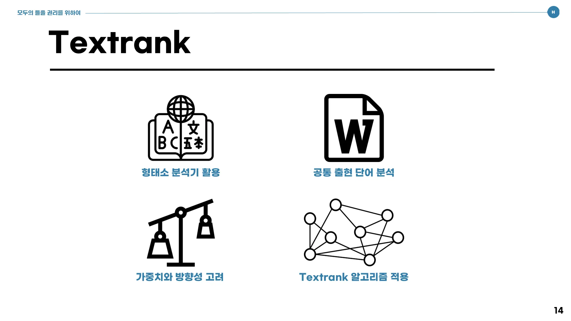 단어 간의 연결 강도를 고려하여 중요한 단어를 선정합니다.