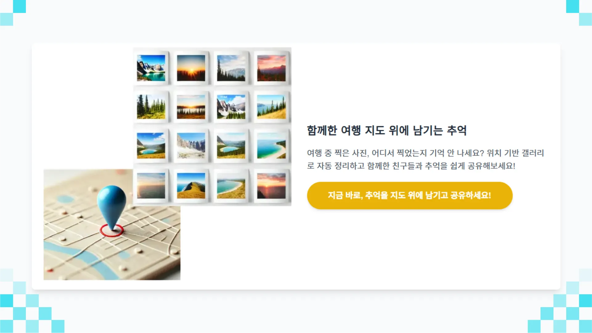 이러한 문제점을 해결하고자 사용자가 여행 사진을 그룹 별로 공유하고 각 사진을 지도에 표시할 수 있는 웹 어플리케이션을 만들고자 하였습니다. 이 서비스를 통해 사용자는 여행 그룹을 생성하고, 그룹 멤버들과 함께 사진을 업로드하여 특정 장소에서의 추억을 공유할 수 있습니다.