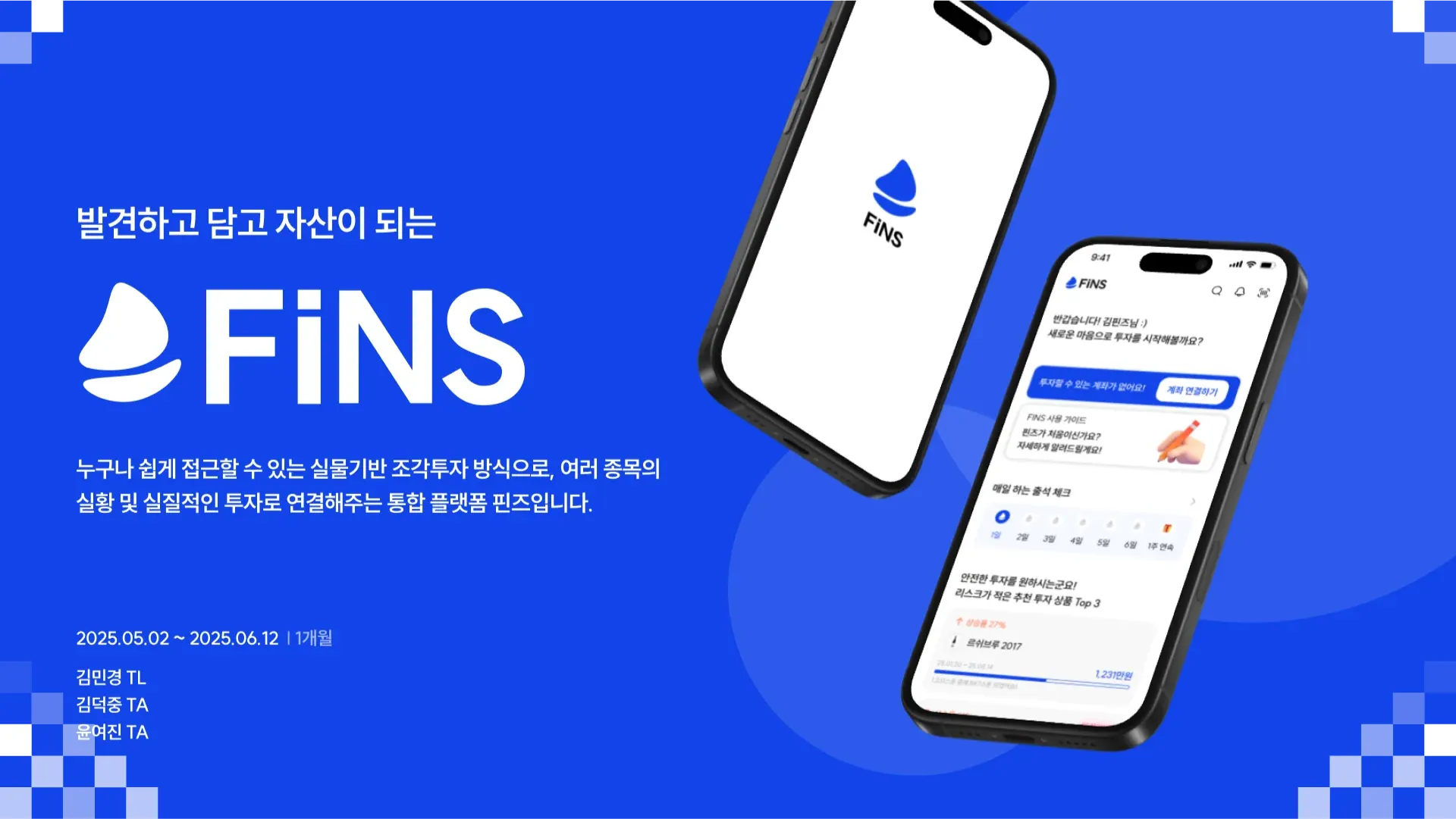 핀즈는 “발견한 것을 핀에 꽂아 담아 자산이 된다”는 의미를 바탕으로, 투자 정보 속에서 신뢰할 수 있는 방향을 제공하는 플랫폼으로 자리매김하고자 브랜딩을 설계했어요!
