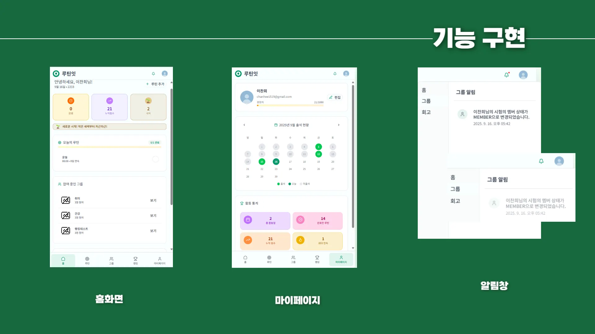 월간 누적 점수, 출석일, 오늘 루틴 성취율, 참여 그룹 현황을 한눈에 확인 가능