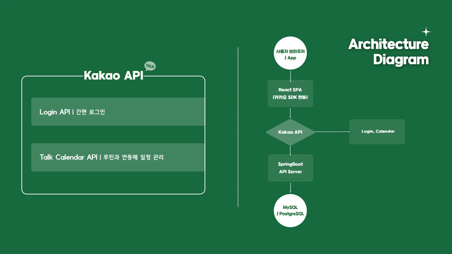 Kakao API | * 소셜 로그인, 톡캘린더 api 사용 | * 사용자 편의성 극대화 |