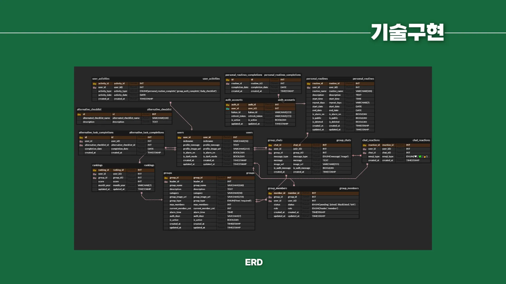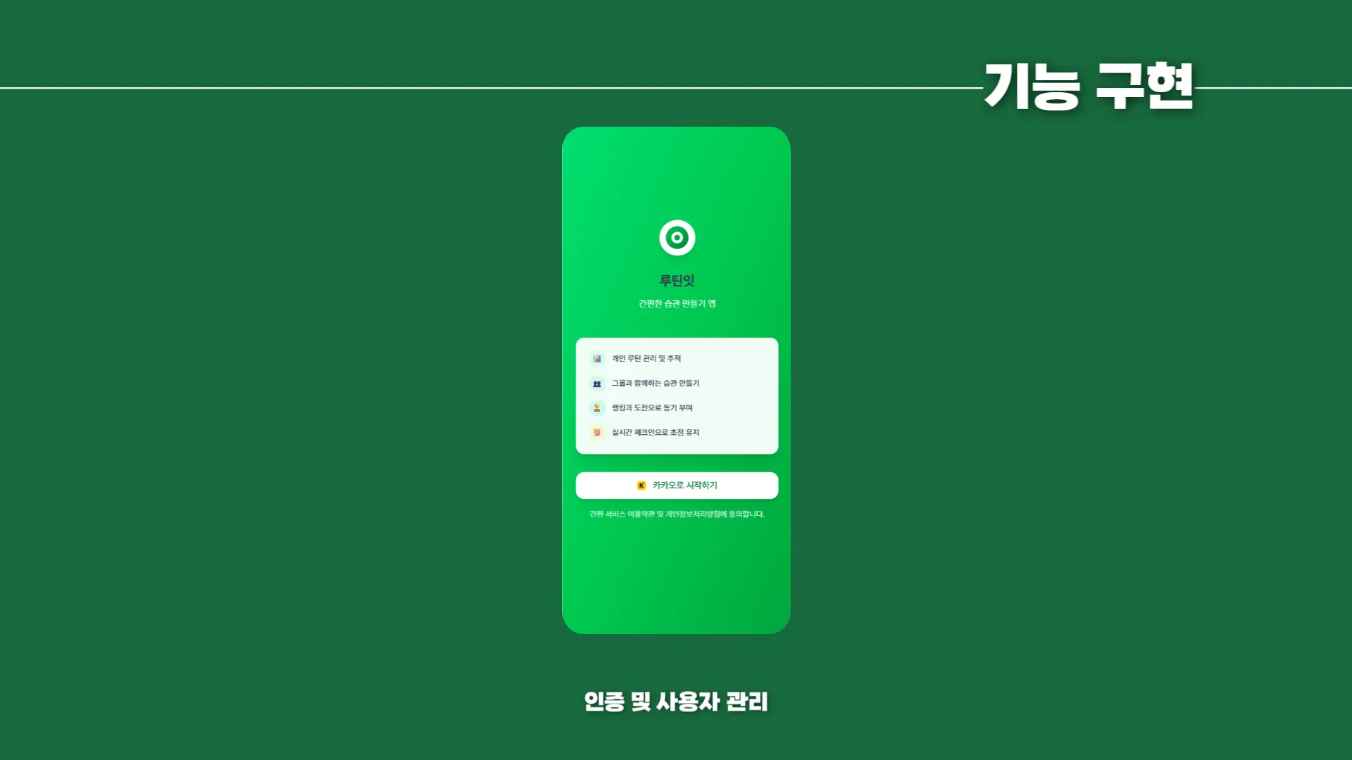 데이터 및 외부 서비스 | MySQL 8.0, Redis, Kakao API, AWS S3 | * MySQL: 영속적 데이터 저장 (루틴, 그룹, 사용자)