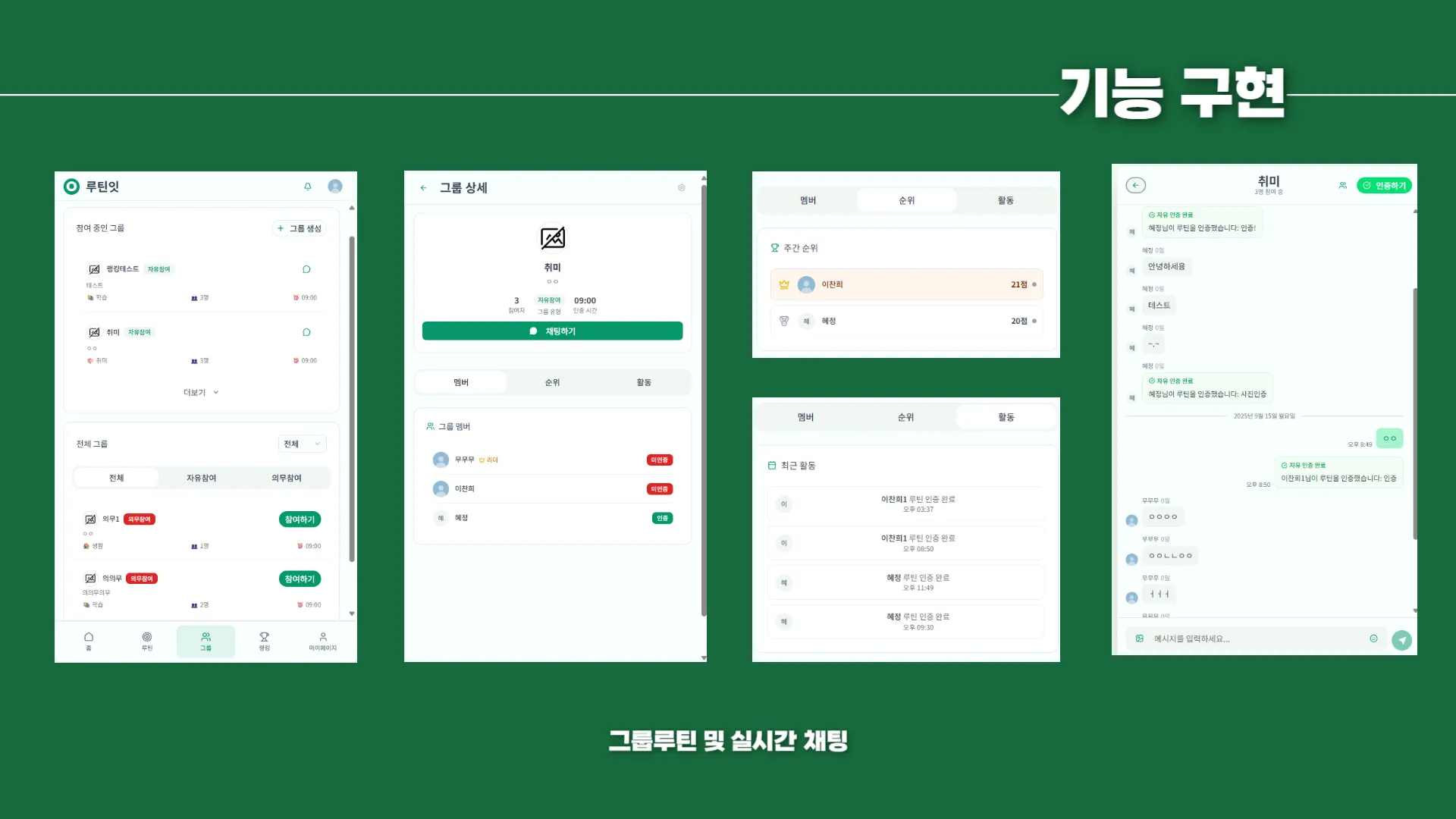 그룹 루틴: 카테고리별 그룹 탐색 후 참여 가능, 실시간 채팅 기능을 통해 그룹원과 소통하며 루틴 실천