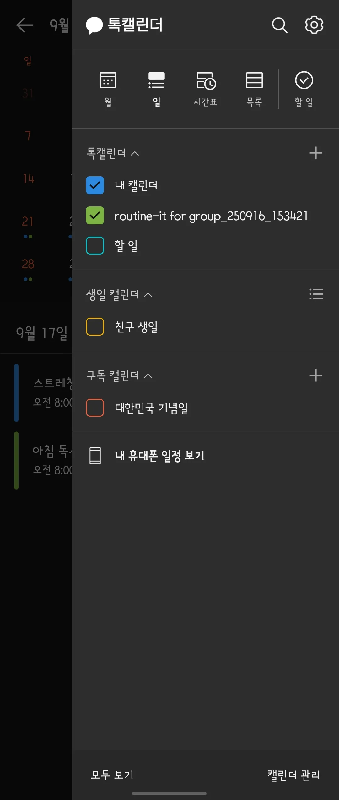 카카오 캘린더 연동 | 개인 루틴 생성/완료 시 해당 일정을 카카오톡 캘린더에 자동 등록 | calendar 도메인 + Kakao 톡 캘린더 API |