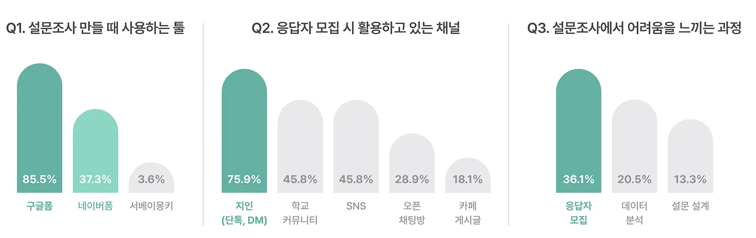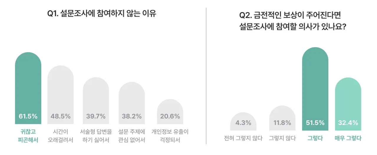 하지만 이러한 커뮤니티 기반의 설문 배포는 대상자가 제한적이고, 설문 참여가 불규칙적이며, 설문의 목표 범위와 품질을 보장하기 어렵습니다. 그렇다면 설문조사에 참여하는 서베이 이용자들은 어떨까요?