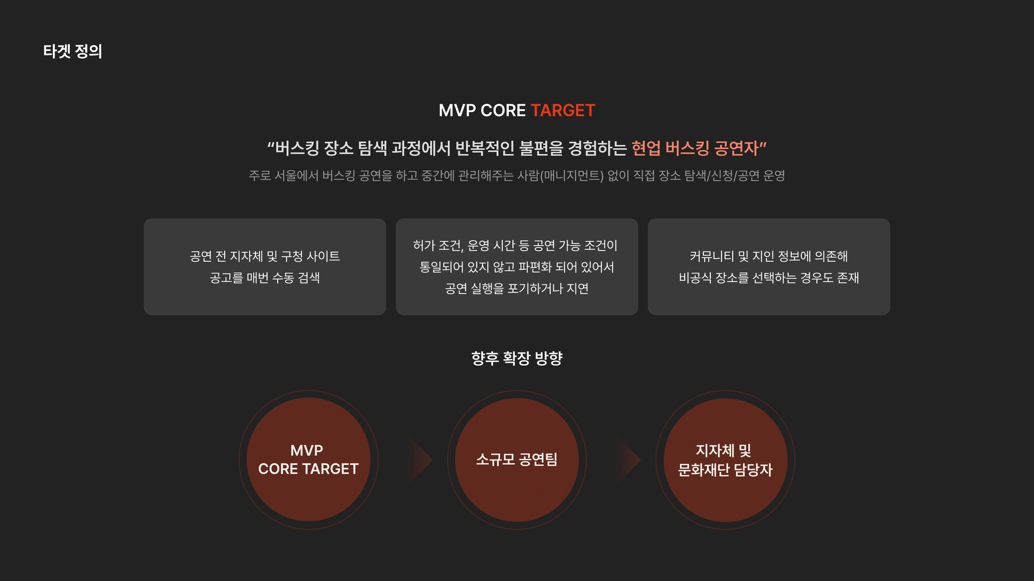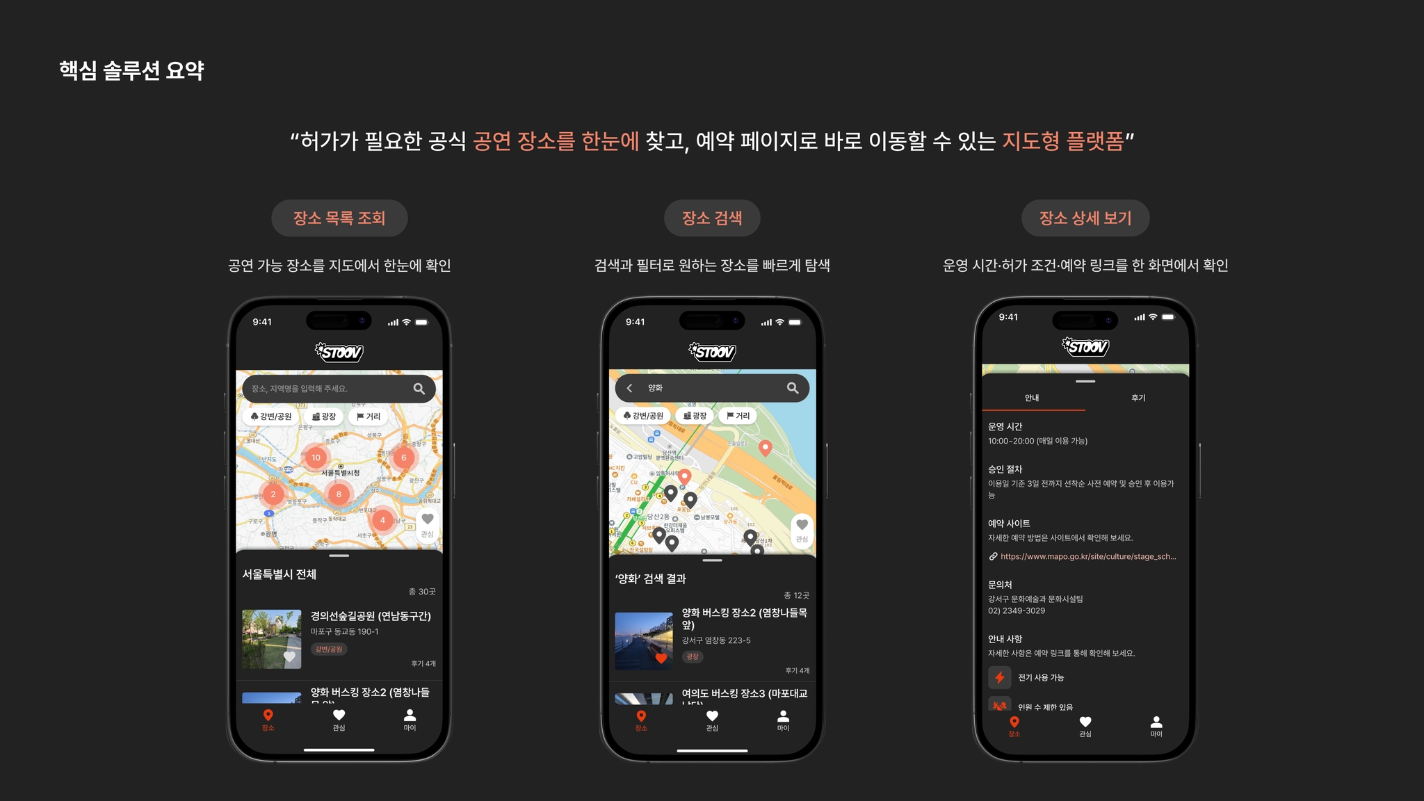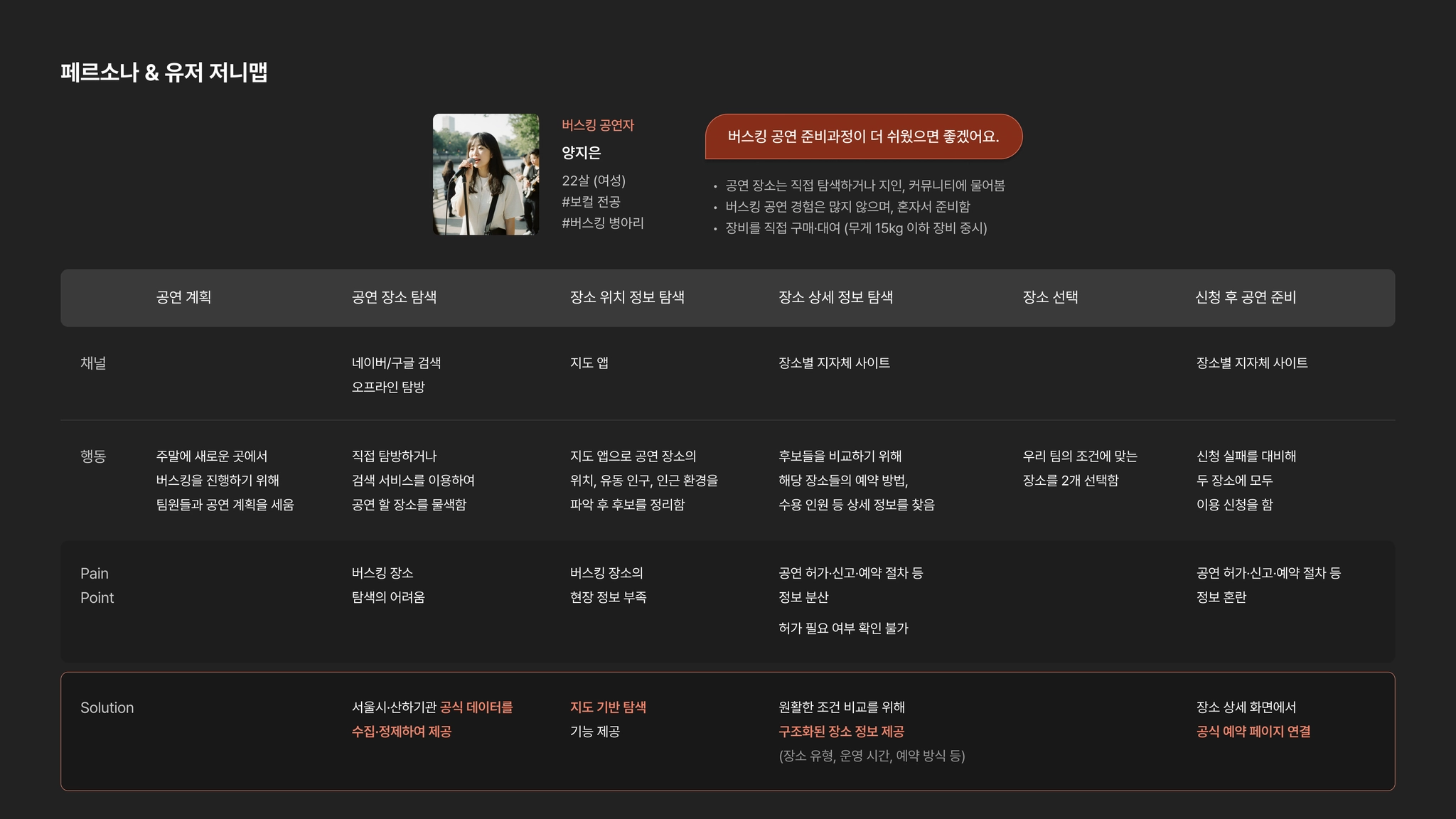 지역·기관별로 상이한 예약 방식 → 장소별 허가 여부·신청 조건 확인의 어려움 → 공연 환경(분위기, 후기, 시설 정보 등) 사전 파악 어려움 → 장소를 예약하고 공연을 실행하는데 있어서 초보 버스커에게 높은 진입 장벽 유발