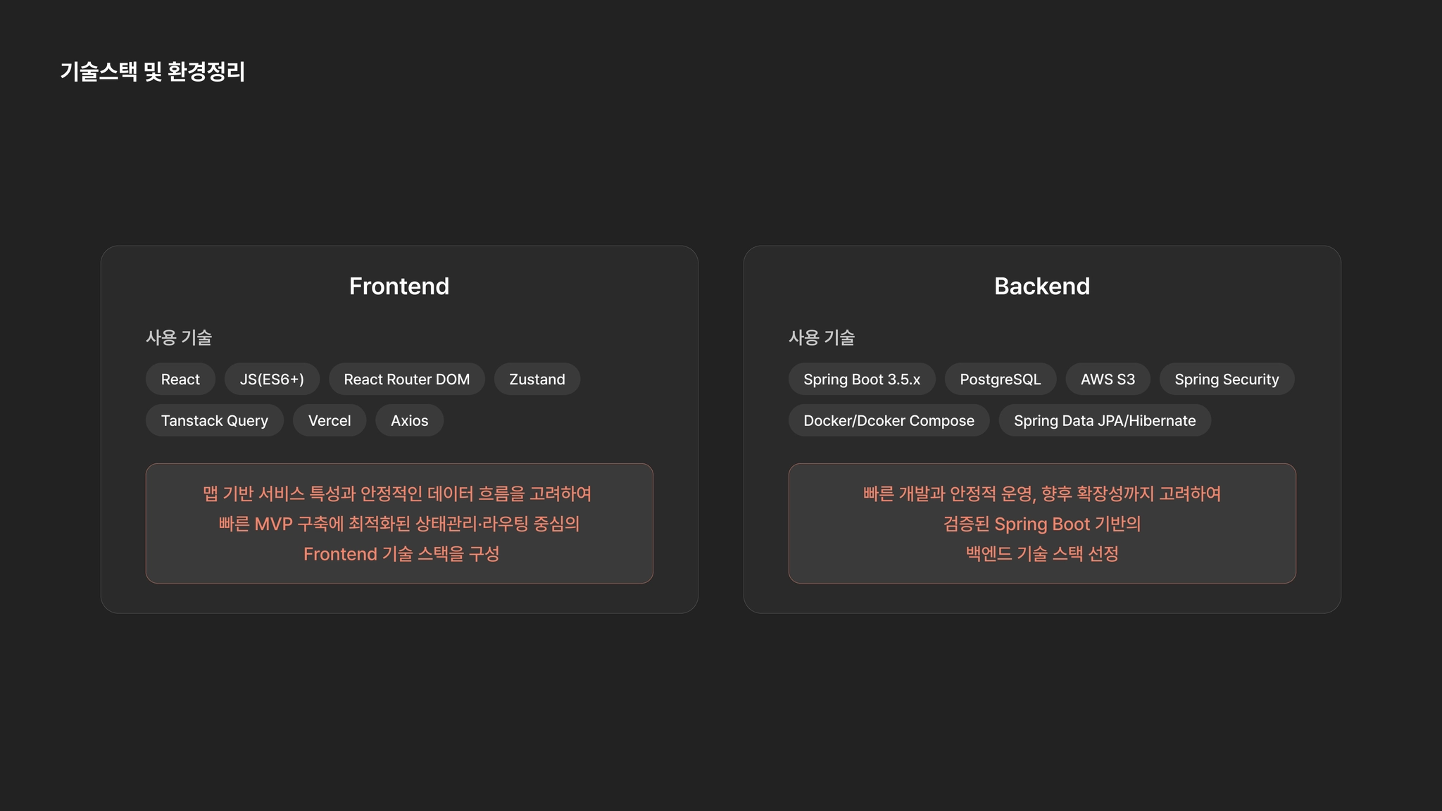 프레임워크 | Java 21, Spring Boot (3.5.x) | 스타터 기반으로 MVP 구현 속도가 매우 빠르고 운영까지 고려한 전체적인 생태계가 갖춰져 있어 추후 확장·관리 용이 |