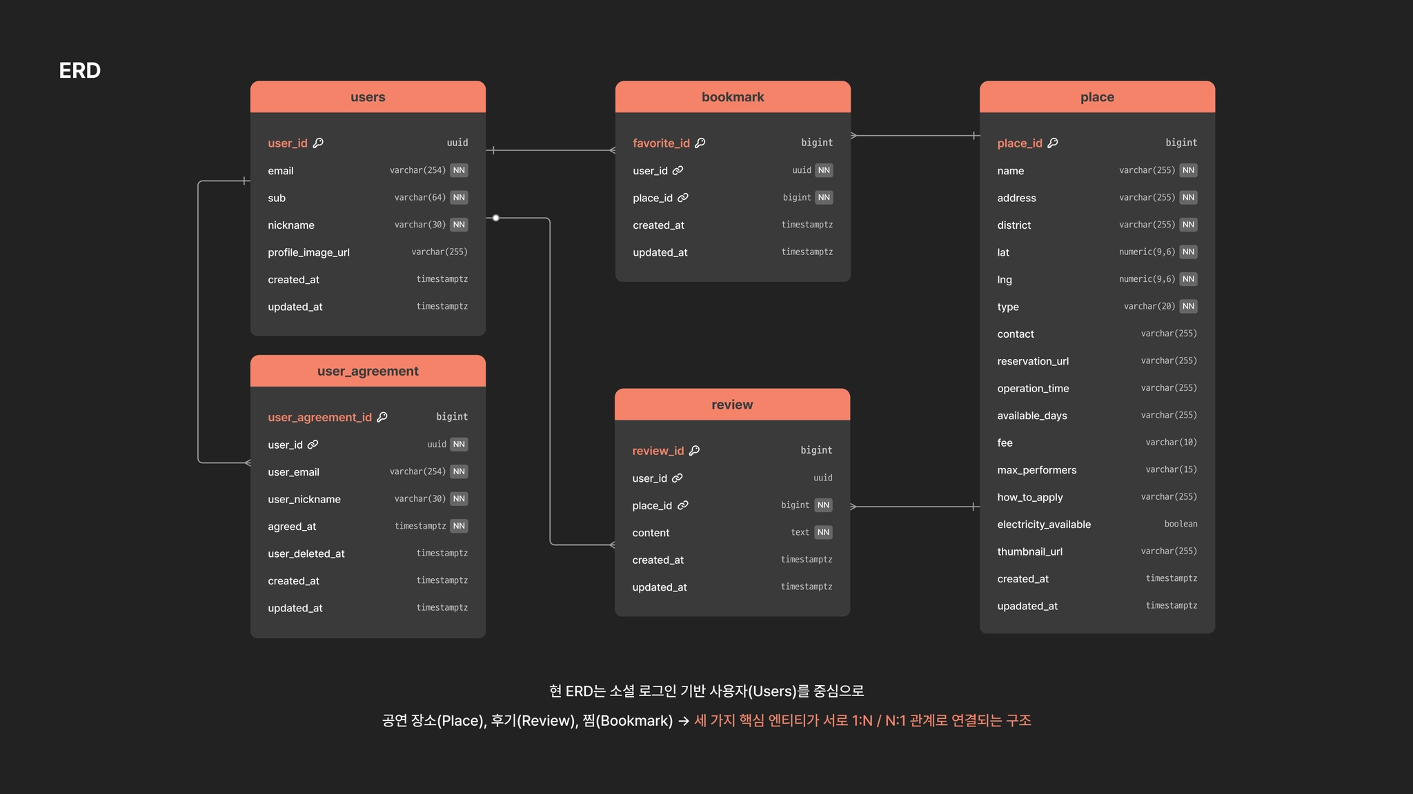 → users - bookmark - review 사이 FK + ON DELETE CASCADE/SET NULL 로 삭제 전파 및 데이터 정합성 보장