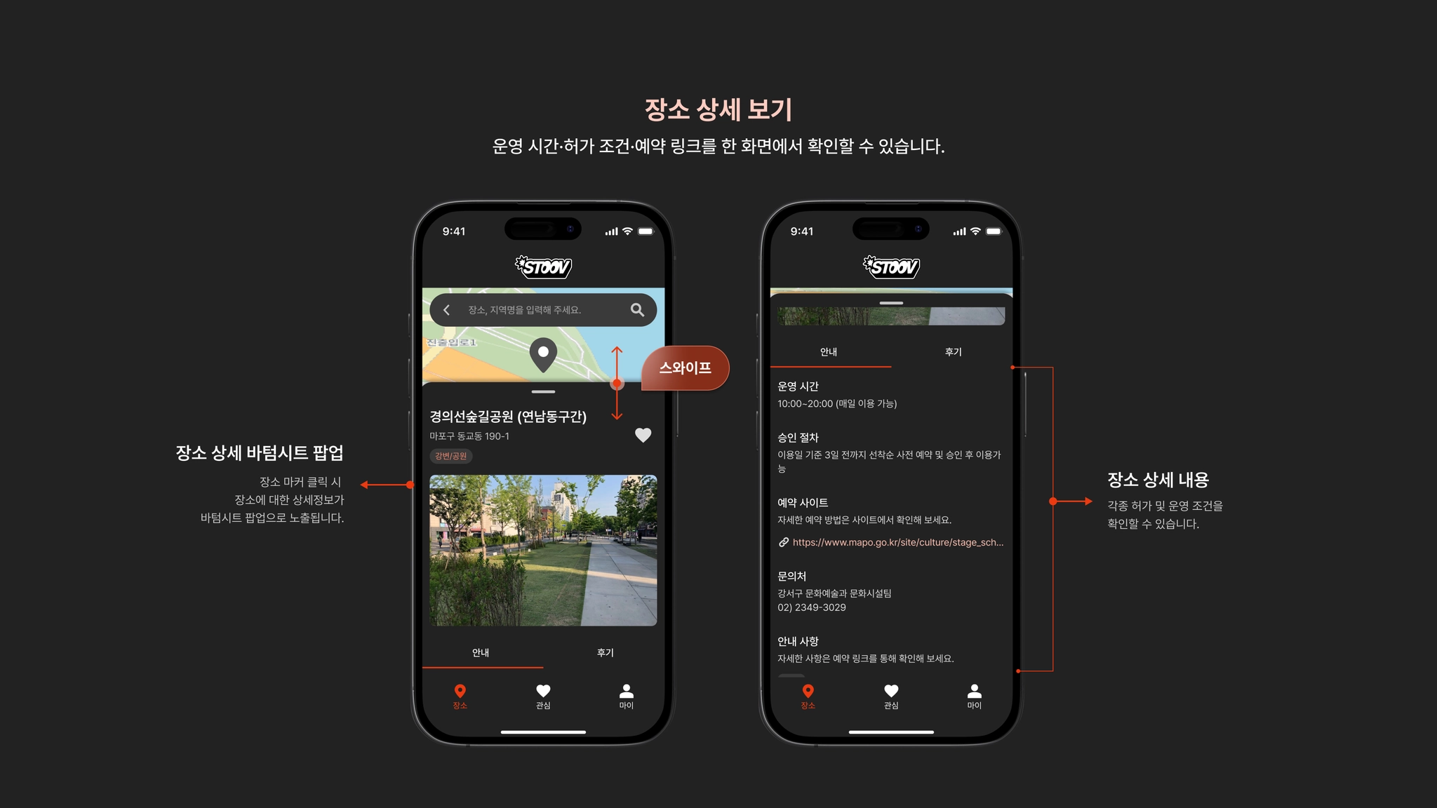 장소별 운영 시간, 허가 조건, 예약 링크를 통합 제공