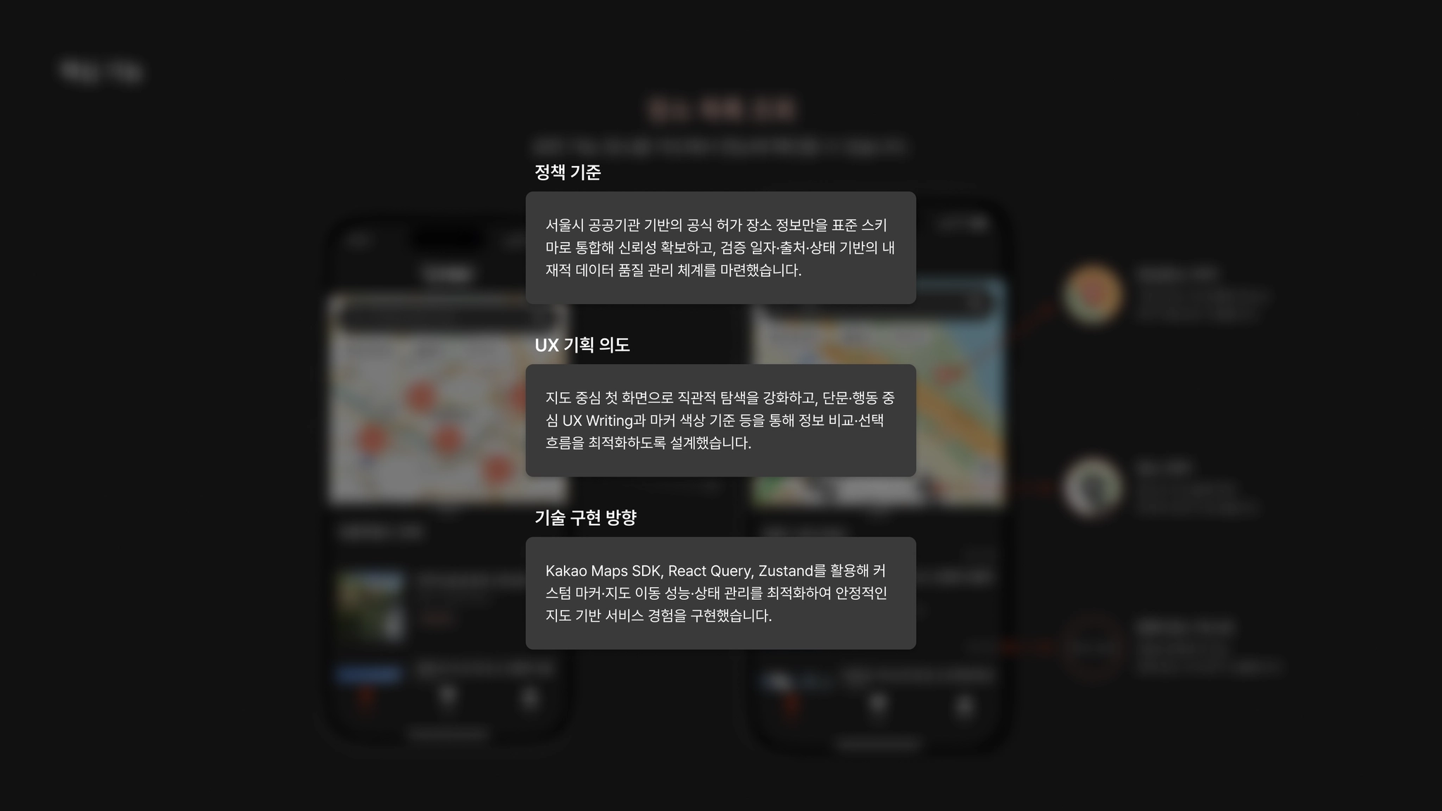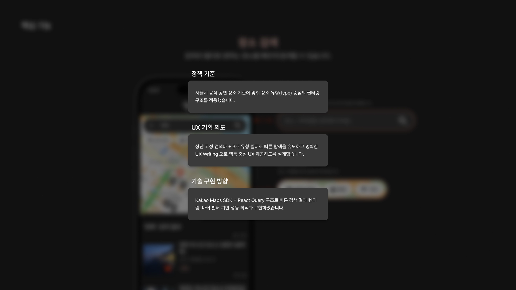 | 서울시·자치구·산하기관 공식 장소 지도 시각화, 검색/필터를 제공한다. | 분산된 정보 통합, 탐색 비용을 최소화한다. | 반복 사이트 방문 필요 → 탐색 피로, 조건 비교 어려움, 공연 가능성 불확실하다 |
