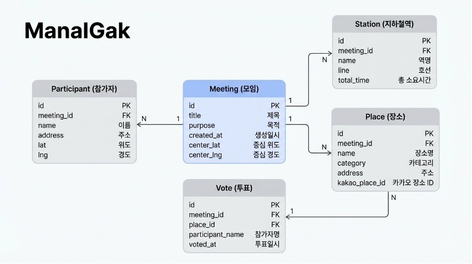 모임 & 참여자: Meeting(1) : Participant(N) 관계로 설계하여 한 모임에 여러 참여자가 속할 수 있도록 했습니다. 참여자별로 출발지 좌표와 이동 수단 정보를 포함하여 중간 지점 계산의 기초 데이터로 활용합니다.