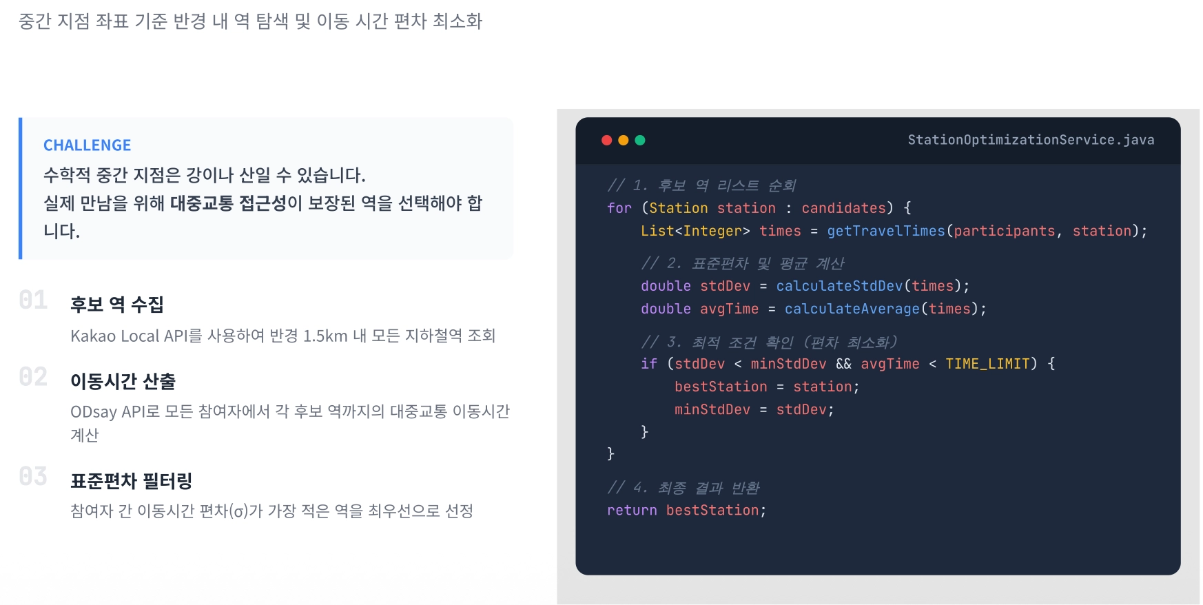 표준편차(이동시간 편차) 최소화 기준으로 최적 역을 선정합니다.