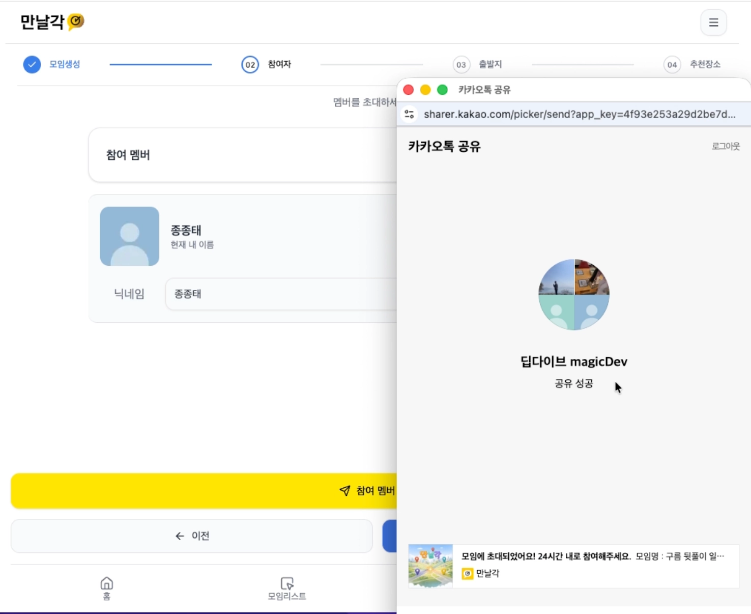 고유 링크 생성: 모임 생성 시 UUID 기반 고유 링크가 발급되어 공유가 가능합니다.