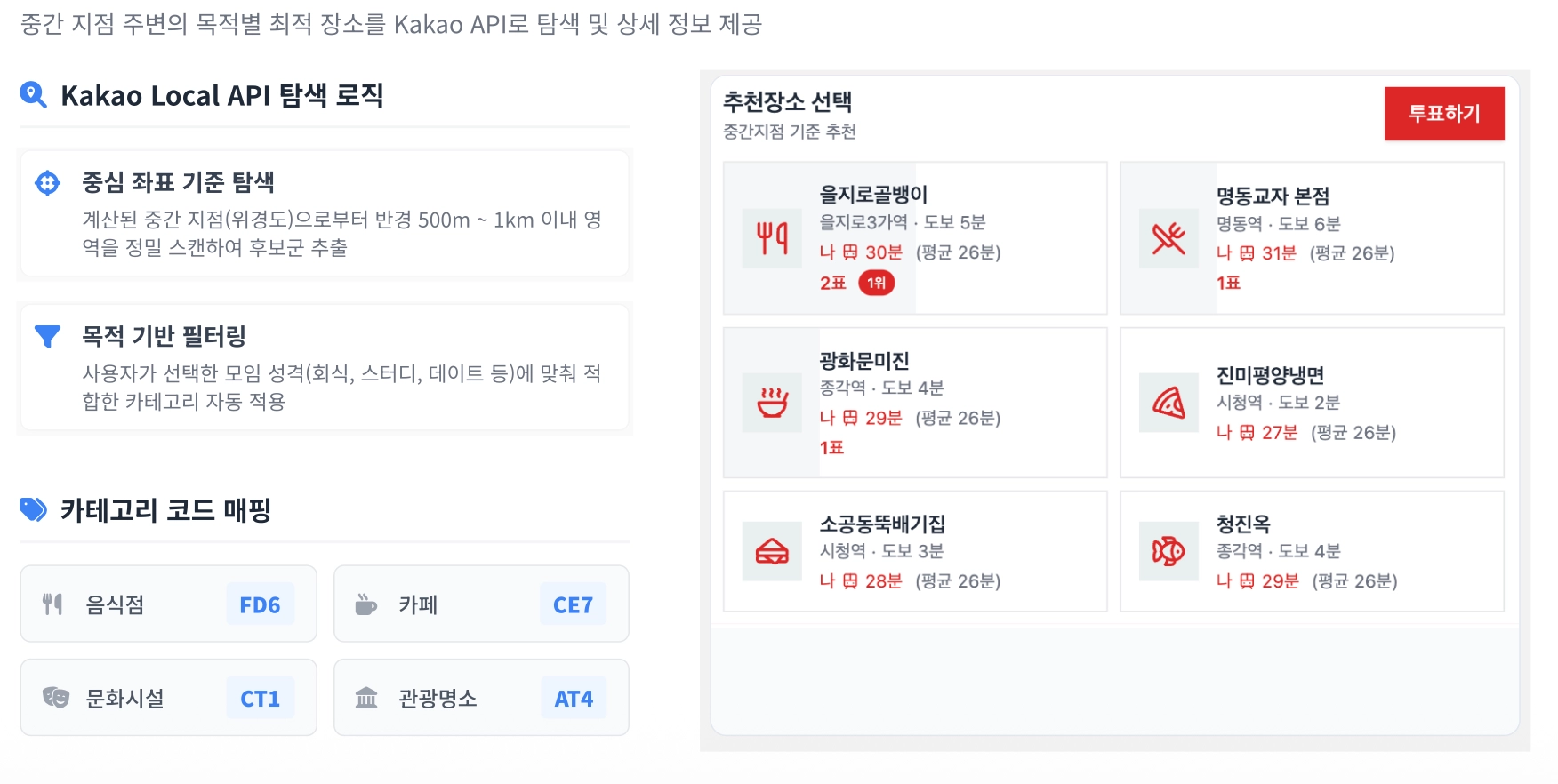 Kakao Local API를 활용해 목적에 맞는 장소를 자동 추천합니다.