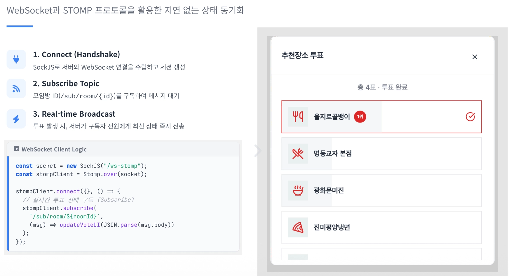 실시간 WebSocket 투표: STOMP 프로토콜 기반으로 실시간 반영되는 투표 시스템을 제공하여 빠르고 명확한 의사결정을 지원합니다.