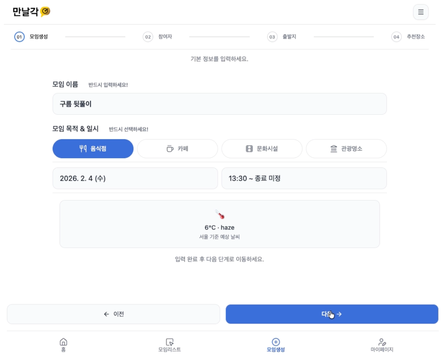 모임 정보 입력: 모임 이름과 목적(회식, 카페, 문화시설, 관광명소)을 선택합니다. 목적에 따라 추천 카테고리가 자동 적용됩니다.