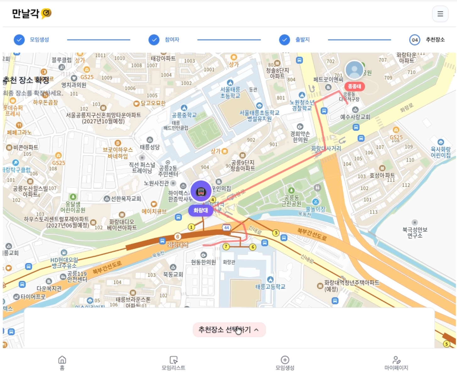 중간 지점이 강/산 등 접근 불가능한 위치일 수 있어, 실제 만남을 위해 접근성 좋은 지하철역을 최종 선택합니다.