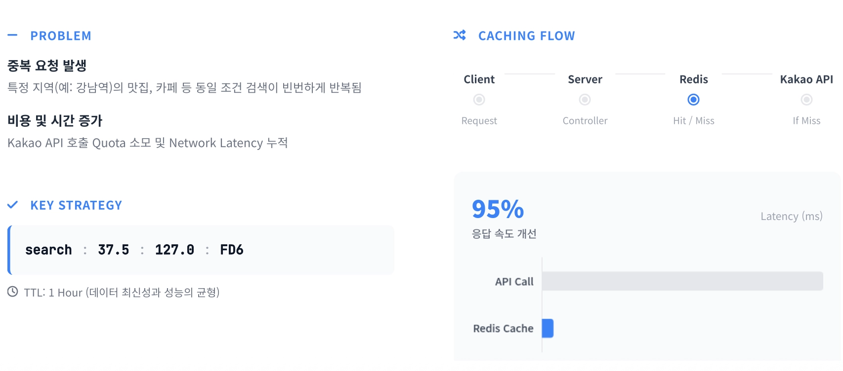 Redis: 캐싱 레이어로 외부 API 응답을 1시간 동안 저장하여 응답 속도를 95% 개선했습니다.