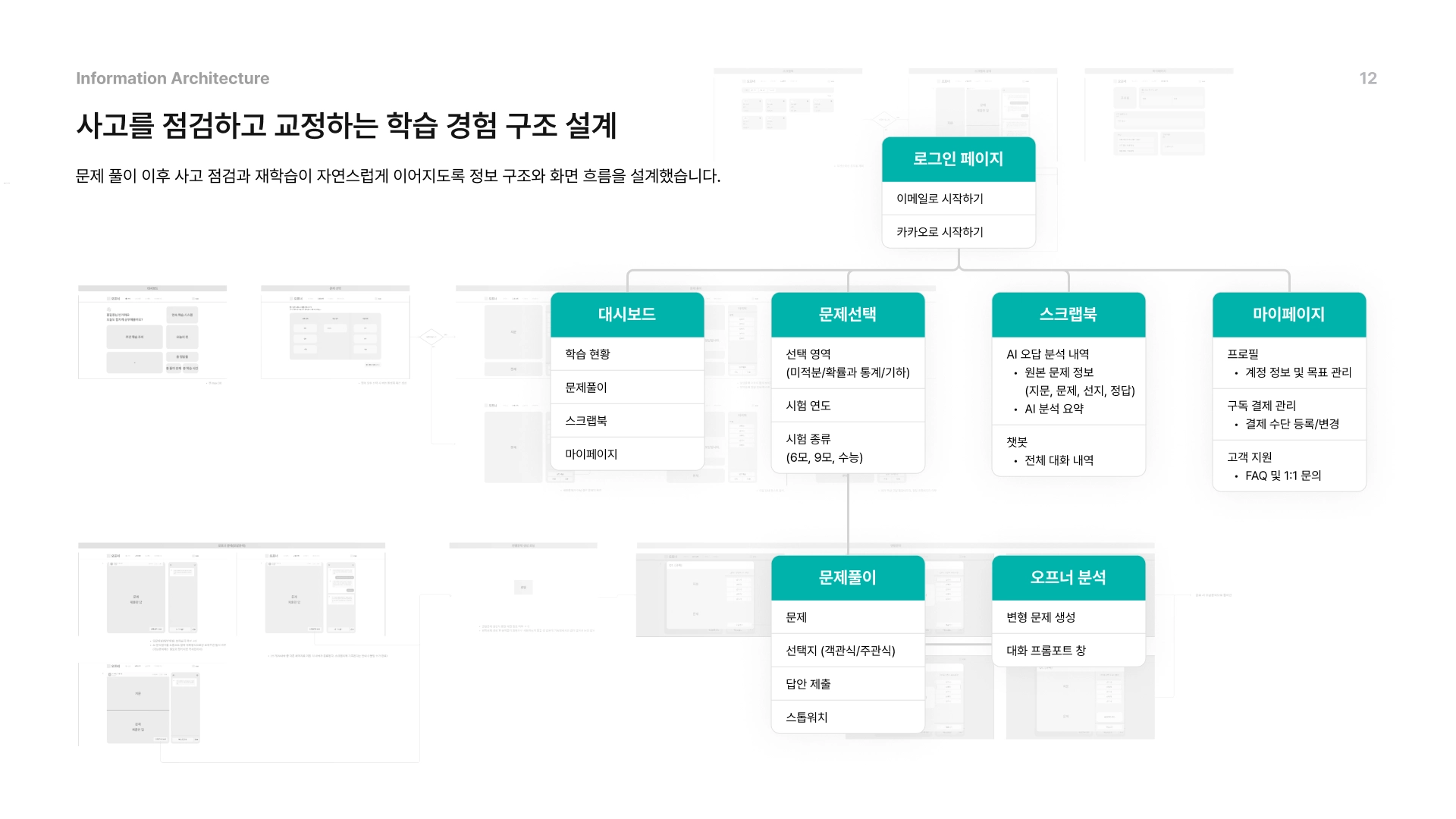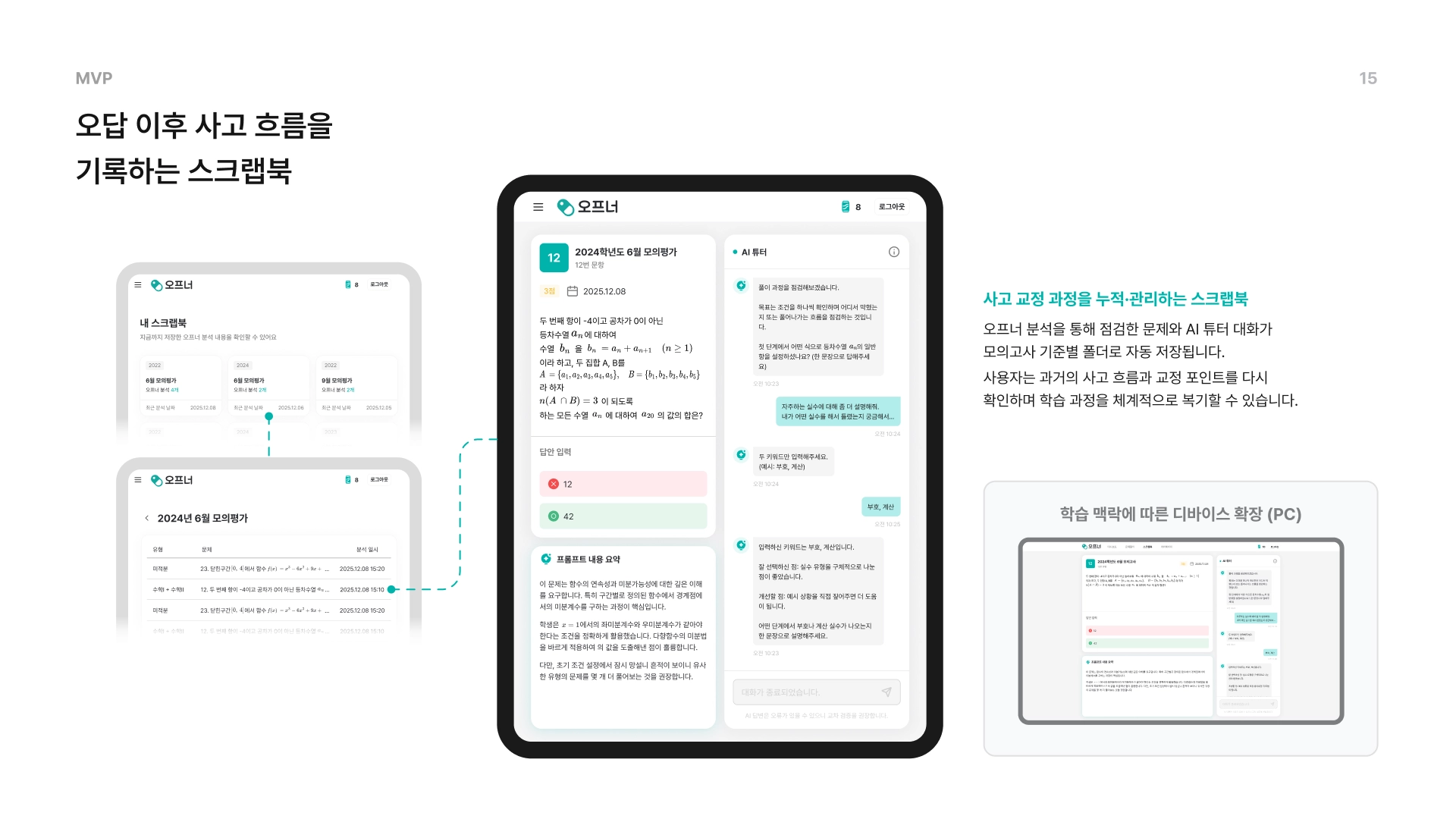 대시보드에서 학습 현황을 확인 → 문제 풀이 → 오프너 분석을 통해 사고 교정 → 이 모든 과정이 스크랩북에 자동 저장. 단순히 문제를 풀고 끝나는 것이 아니라 풀이 - 분석 - 기록으로 이어지는 선순환 구조로 설계하였습니다.