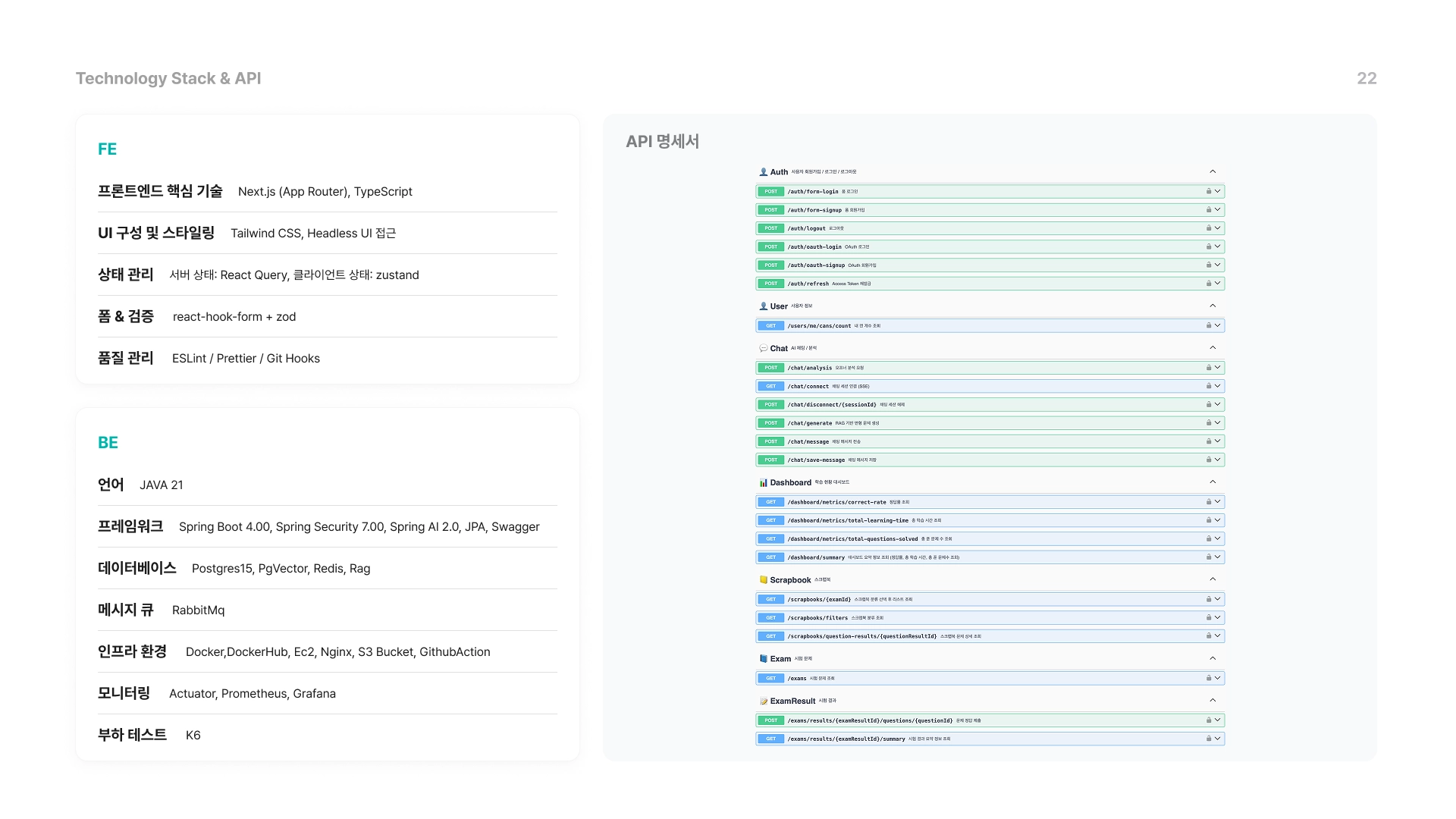 품질 관리 | ESLint + Prettier + Git Hooks | 코드 일관성 유지 및 자동 포맷팅 |