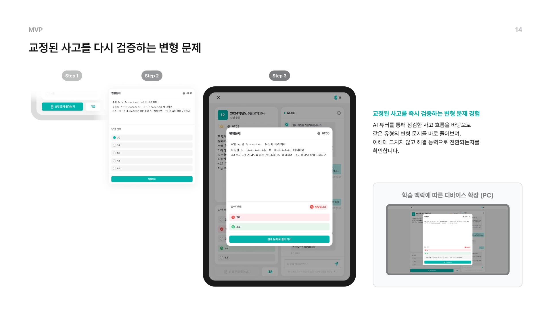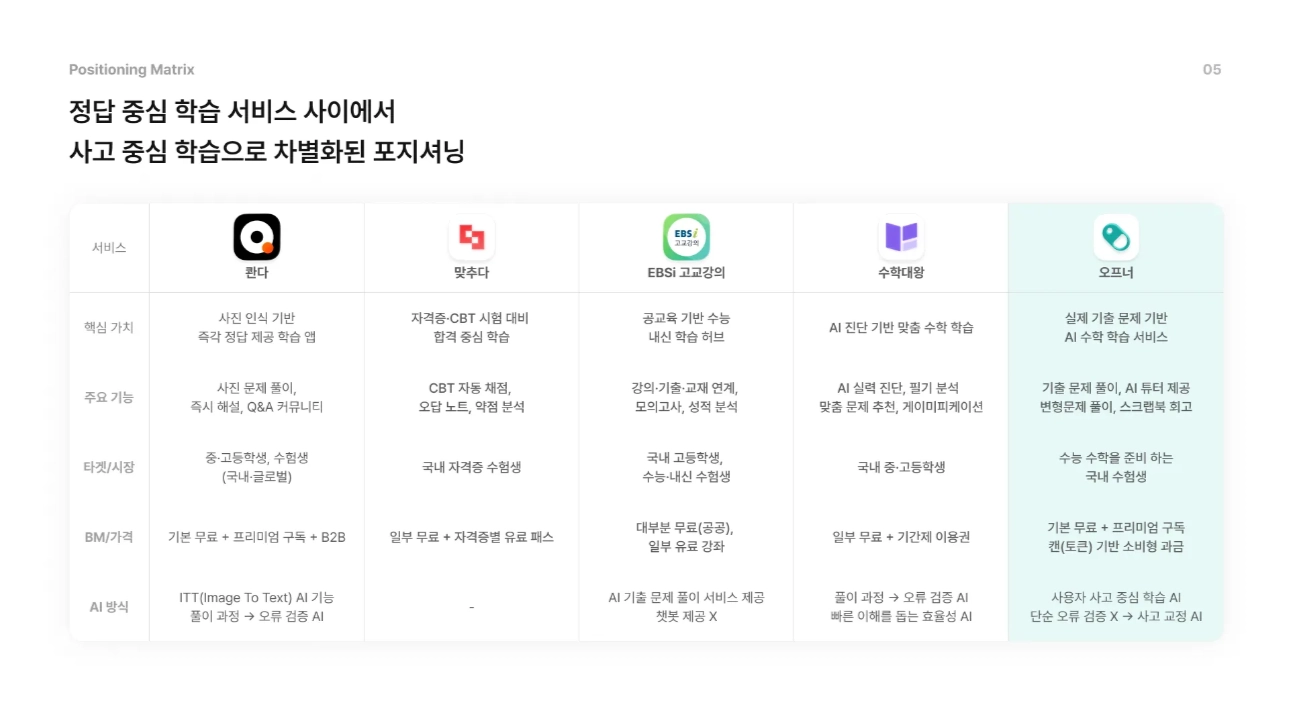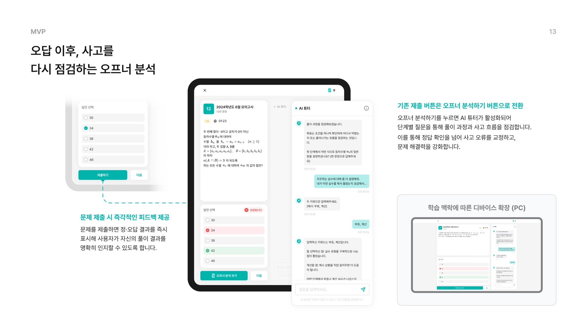 오프너가 제안하는 변화는 명확합니다. 기존의 학습(As - is)이 해설지를 보고 ‘아, 그렇구나.’ 하고 넘어가는 수동적 이해였다면, 오프너의 학습(To -be)은 AI 튜터의 역질문을 통해 ‘내가 왜 여기서 틀렸지?’를 고민하는 능동적 사고로 전환되는 것입니다. 나아가 변형 문제를 통해 교정된 사고를 즉시 검증함으로써, ‘아는 것’ 과 ‘풀 수 있는 것’을 명확히 구분하게 만듭니다.