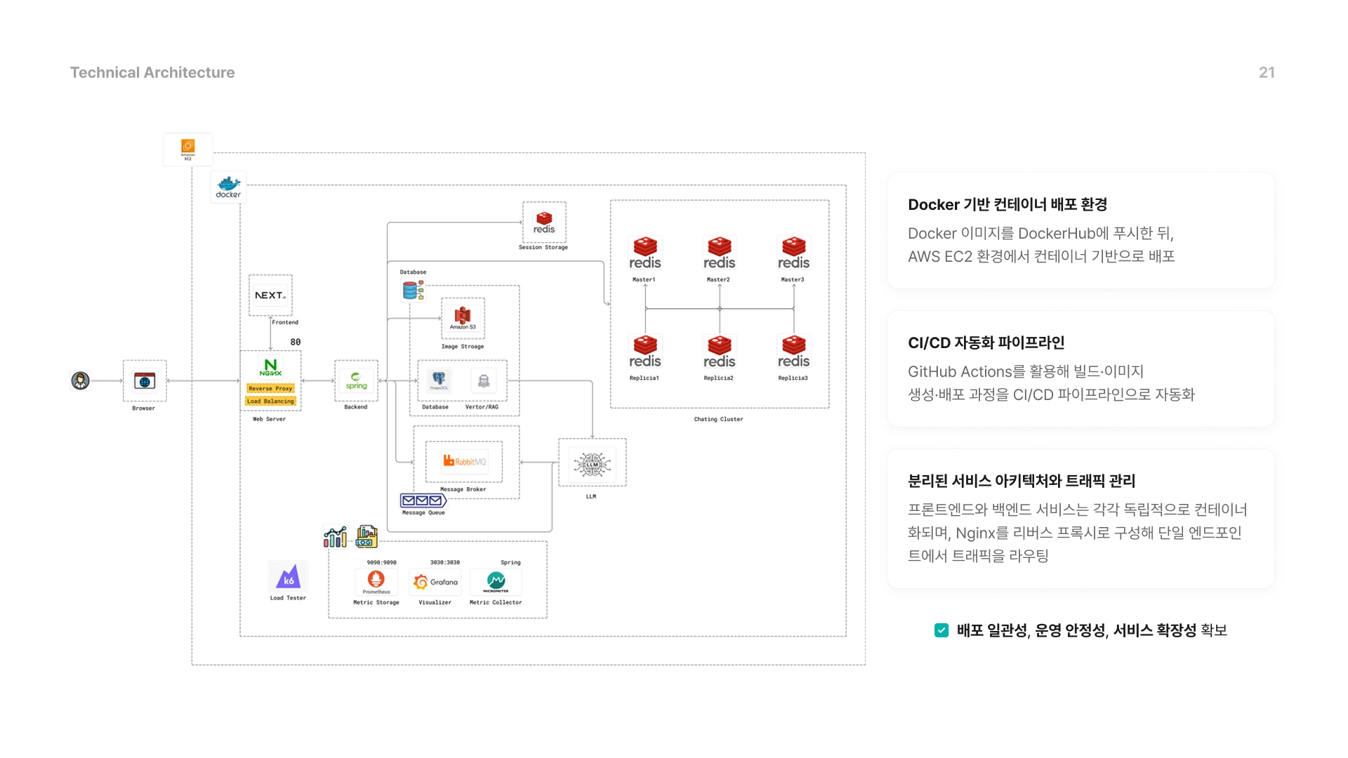 캐시/세션 | Redis | 채팅 데이터 임시 저장, 세션 관리, 응답 캐싱 |