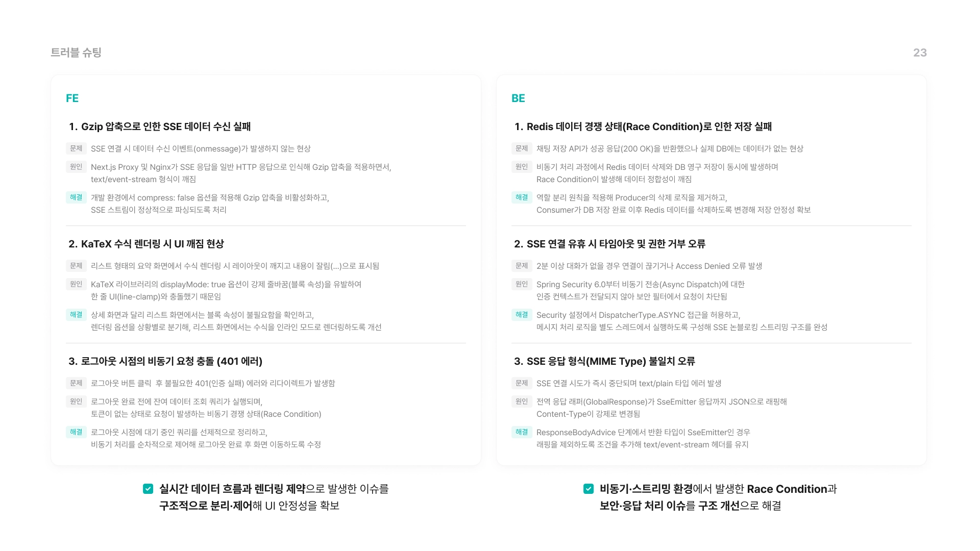 AI 튜터의 응답을 SSE(Server-Sent Events) 기반으로 실시간 스트리밍 전송합니다. 사용자는 AI가 "생각하는" 과정을 실시간으로 확인하며 자연스러운 대화 경험을 느낄 수 있습니다.