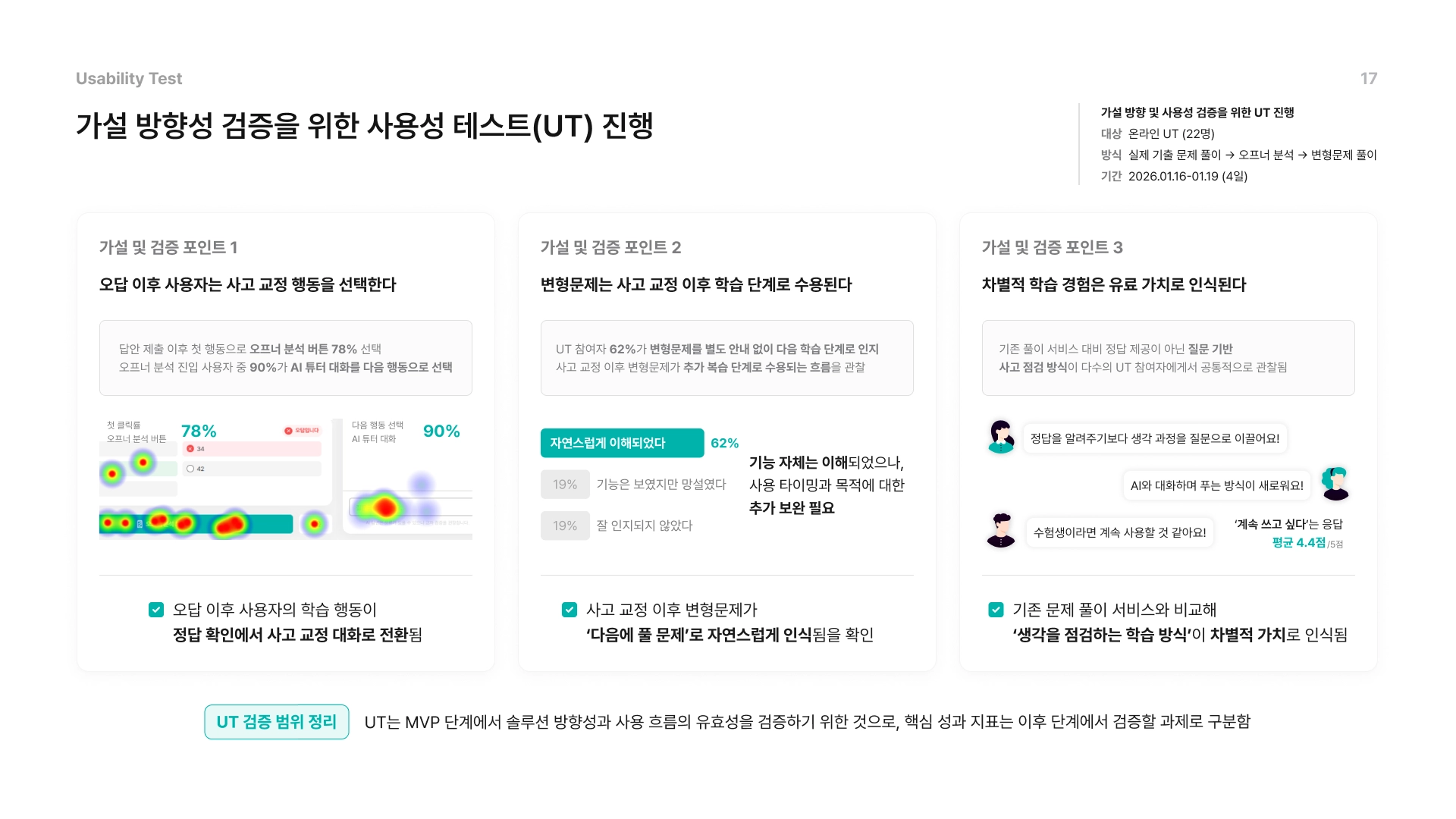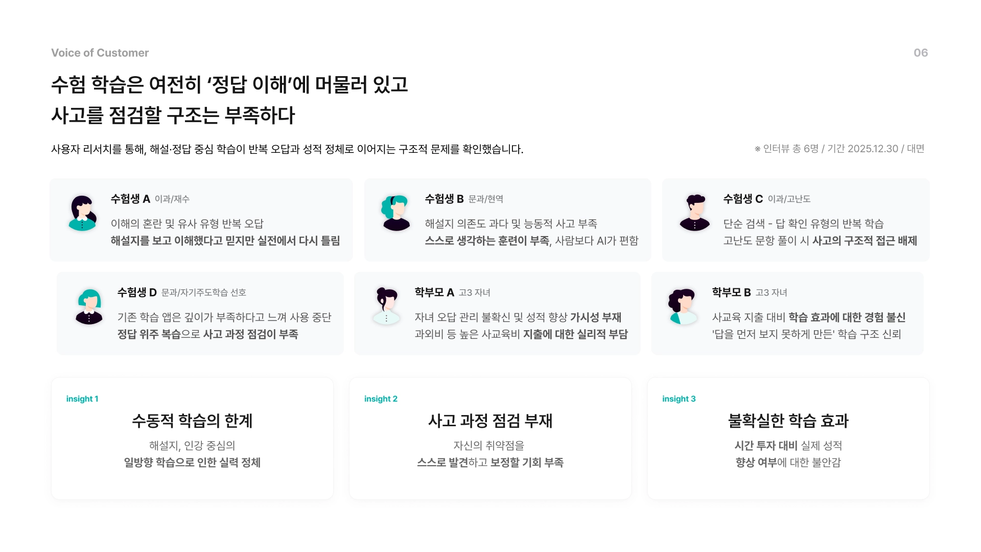 → 결국, 수동적인 학습의 한계를 끊고, 사고 과정을 점검해 줄 수 있는 도구가 절실하다는 것을 확인할 수 있었습니다.