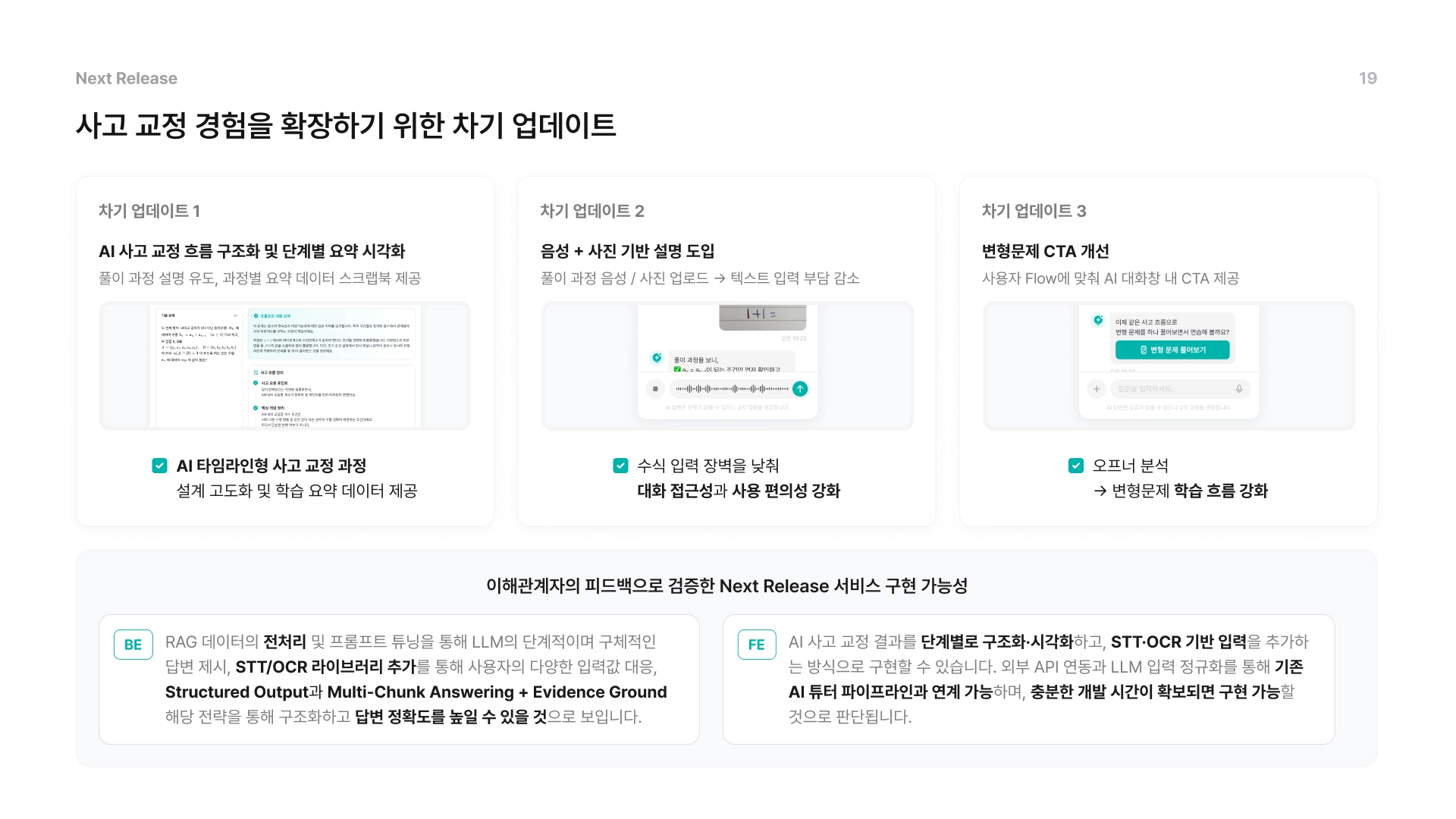 변형 문제로 넘어가는 CTA(버튼 플로우) 가 눈에 잘 띄지 않는 다는 개선점 파악, AI 답변 정합성 업그레이드 등 여러 개선점들 추가로 파악 완료하였음