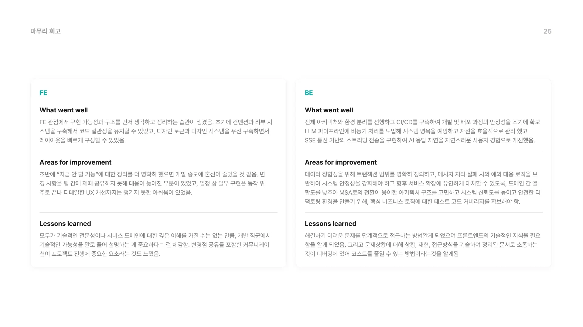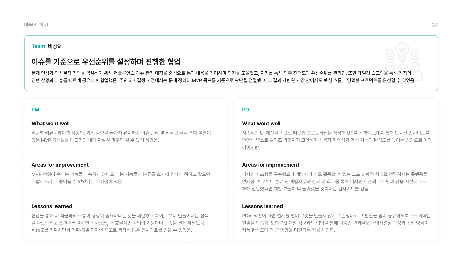 이는 짧은 프로젝트 기간 내에 높은 완성도의 MVP를 뽑아낼 수 있었던 기반이 되었습니다.