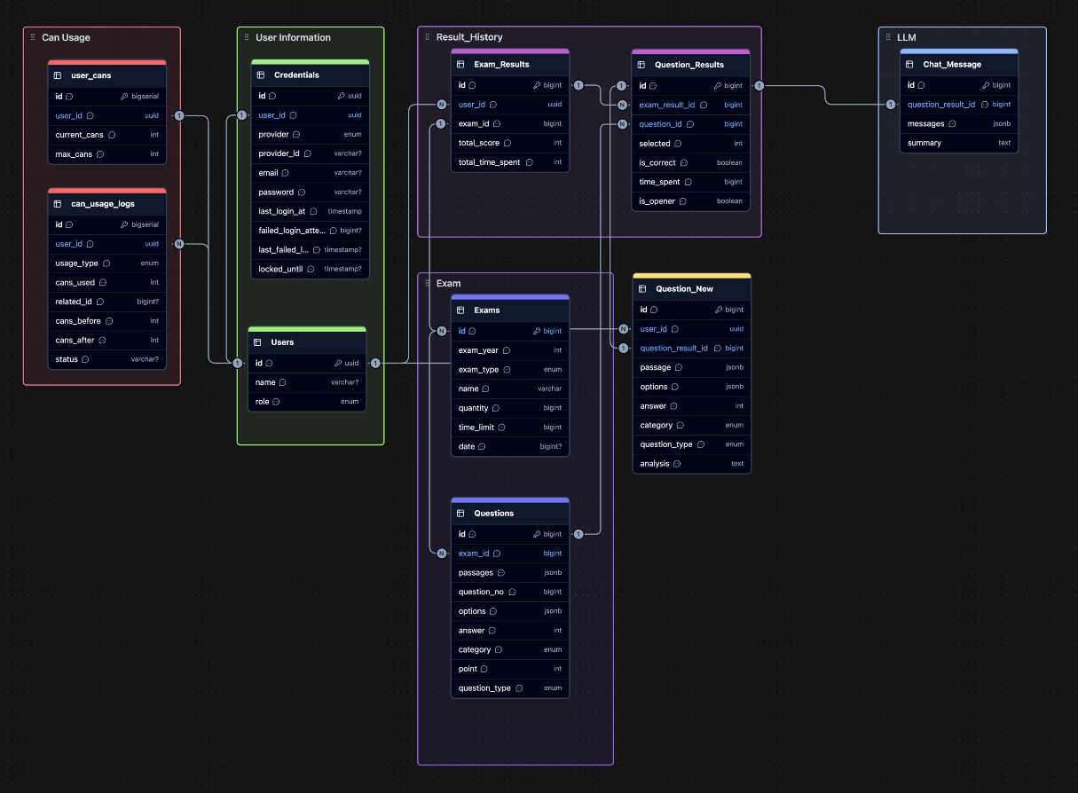 Question_Results | exam_result_id | bigint | - | NOT NULL, FK → Exam_Results.id | 시험 결과 ID |