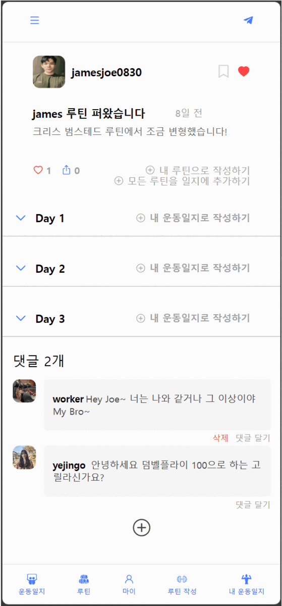 1) 운동일지와 루틴의 댓글을 통해 사람들과 소통해요!