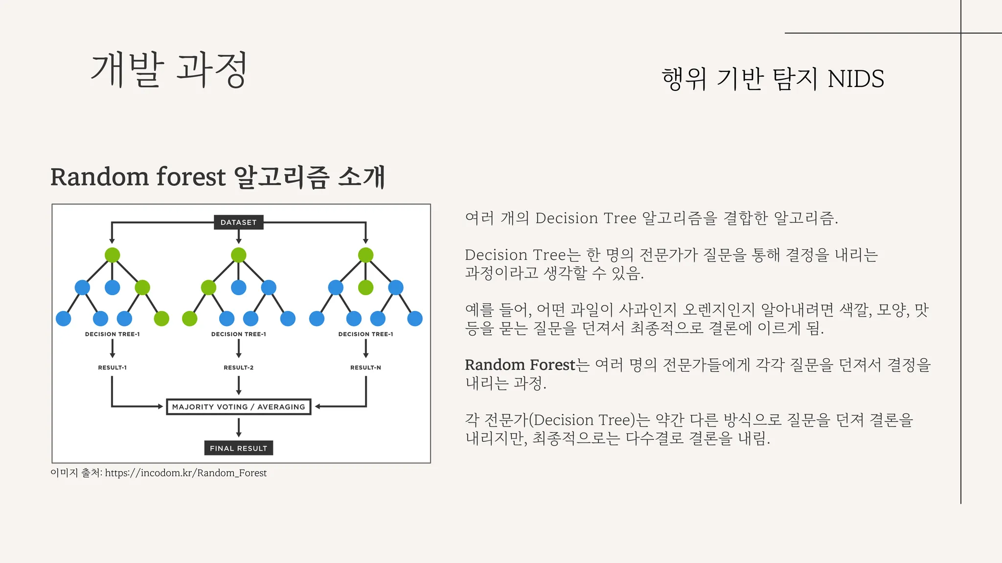 랜덤 포레스트 알고리즘은 여러 개의 decision tree 알고리즘을 결합한 알고리즘이다. decision tree 여러 개의 결과를 보고, 최종적으로 다수결로 판단하여 결론을 내리는 방식으로 작동한다.