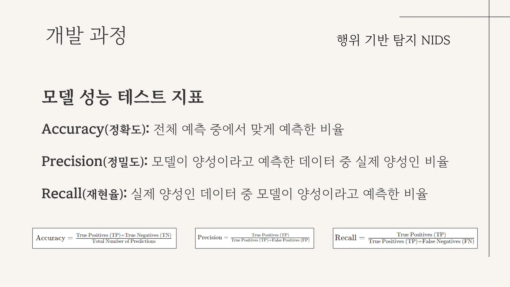 위에서 선택한 6가지의 알고리즘을 NSL-KDD 데이터셋에 적용하여 머신 러닝을 시도했을 때, 성능 지표로 어떤 알고리즘이 해당 데이터셋에 더 적합한지 판단할 수 있다. 대표적인 모델 성능 테스트 지표로는 정확도, 정밀도, 재현율이 있다.