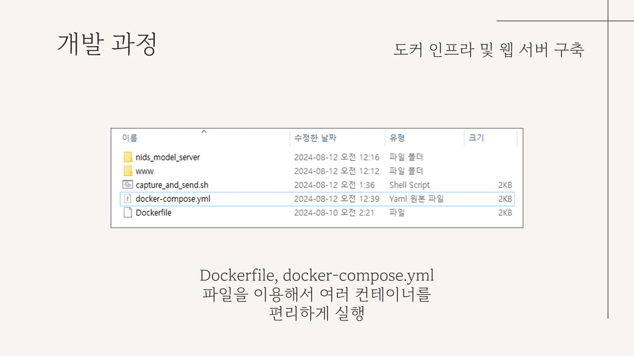 해당 컨테이너들을 docker compose를 활용하여 편리하게 실행할 수 있도록 구성했다.