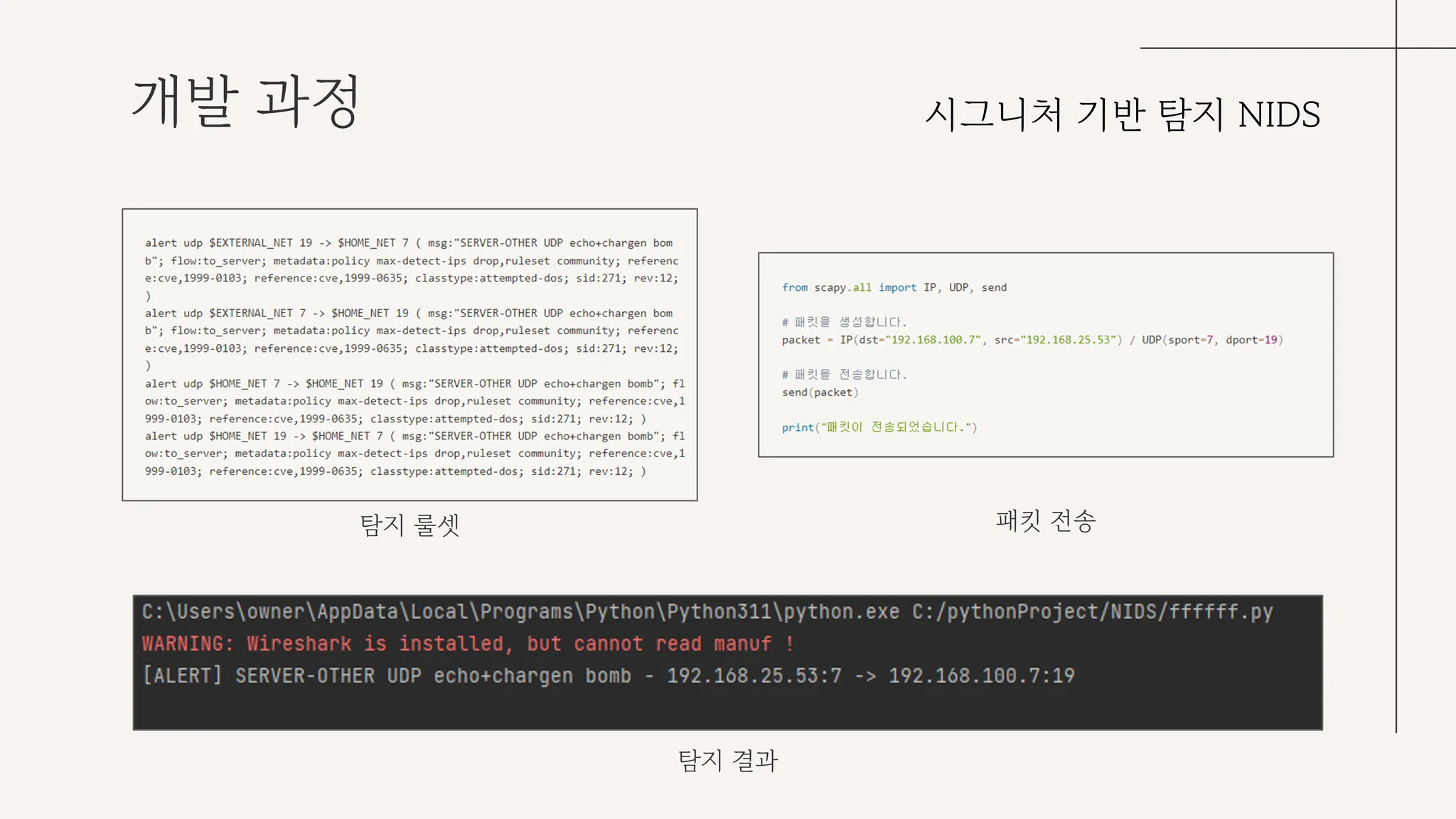 시그니처 DB를 구축하고 NIDS화 시키는데 사용된 기술은 python이다.