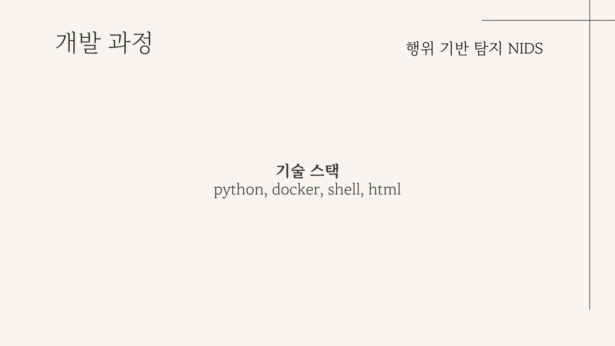 행위 기반 탐지 NIDS 모델 개발에 사용한 기슬 스택으로는 python, docker, shell, html 등이 있다.