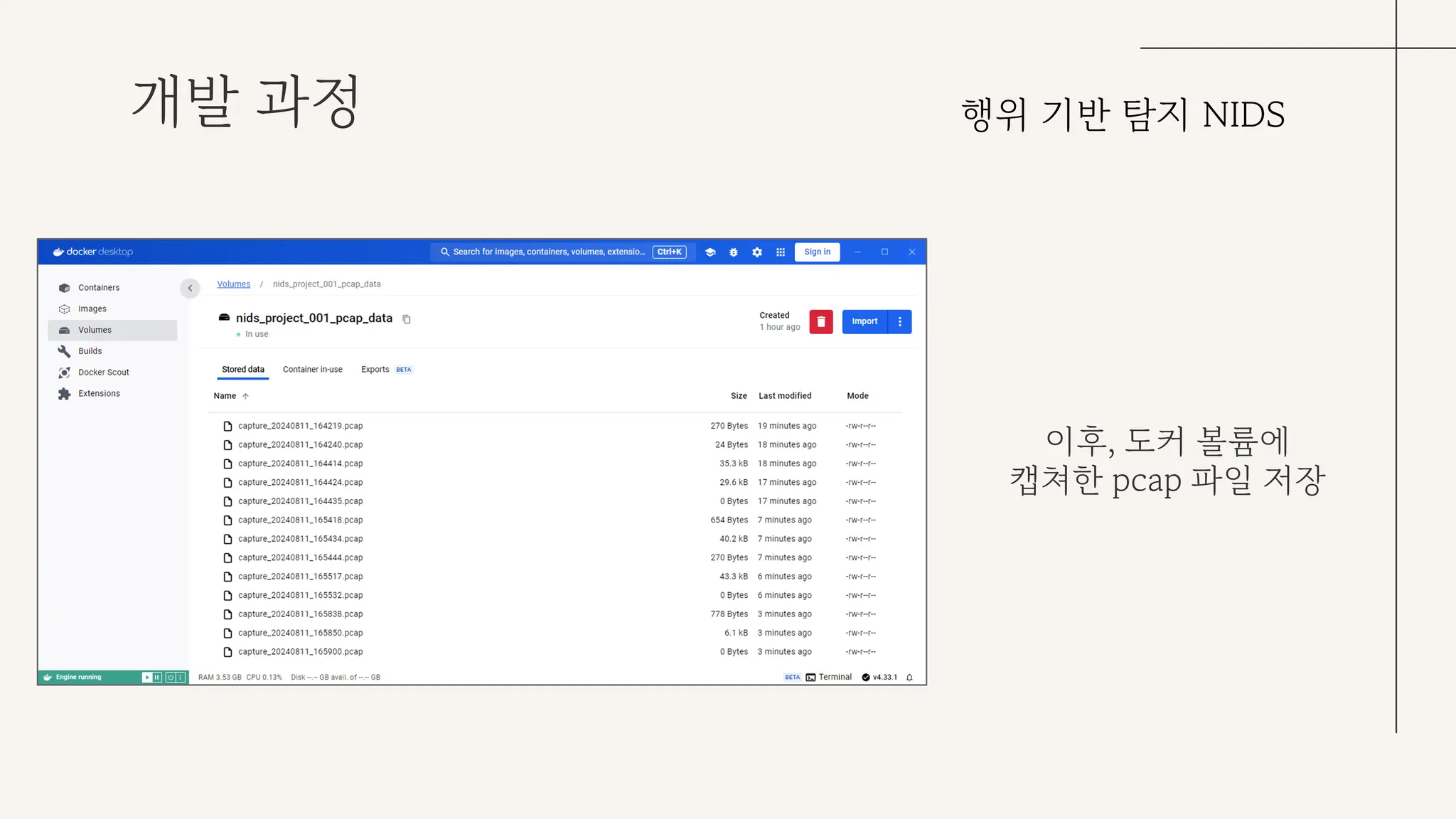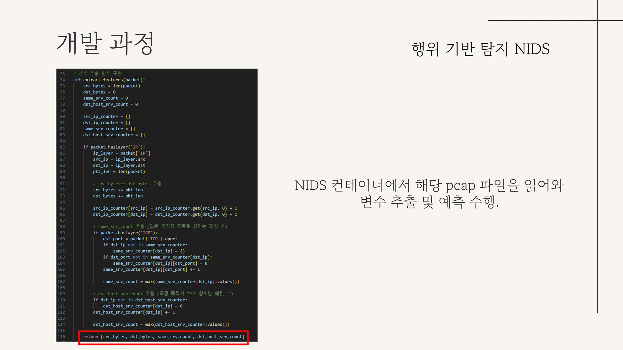 도커 볼륨에 저장한 pcap 파일을 같은 도커 네트워크에 있는 NIDS 컨테이너에서 읽어와 학습에 사용한 4개의 변수를 추출한다.