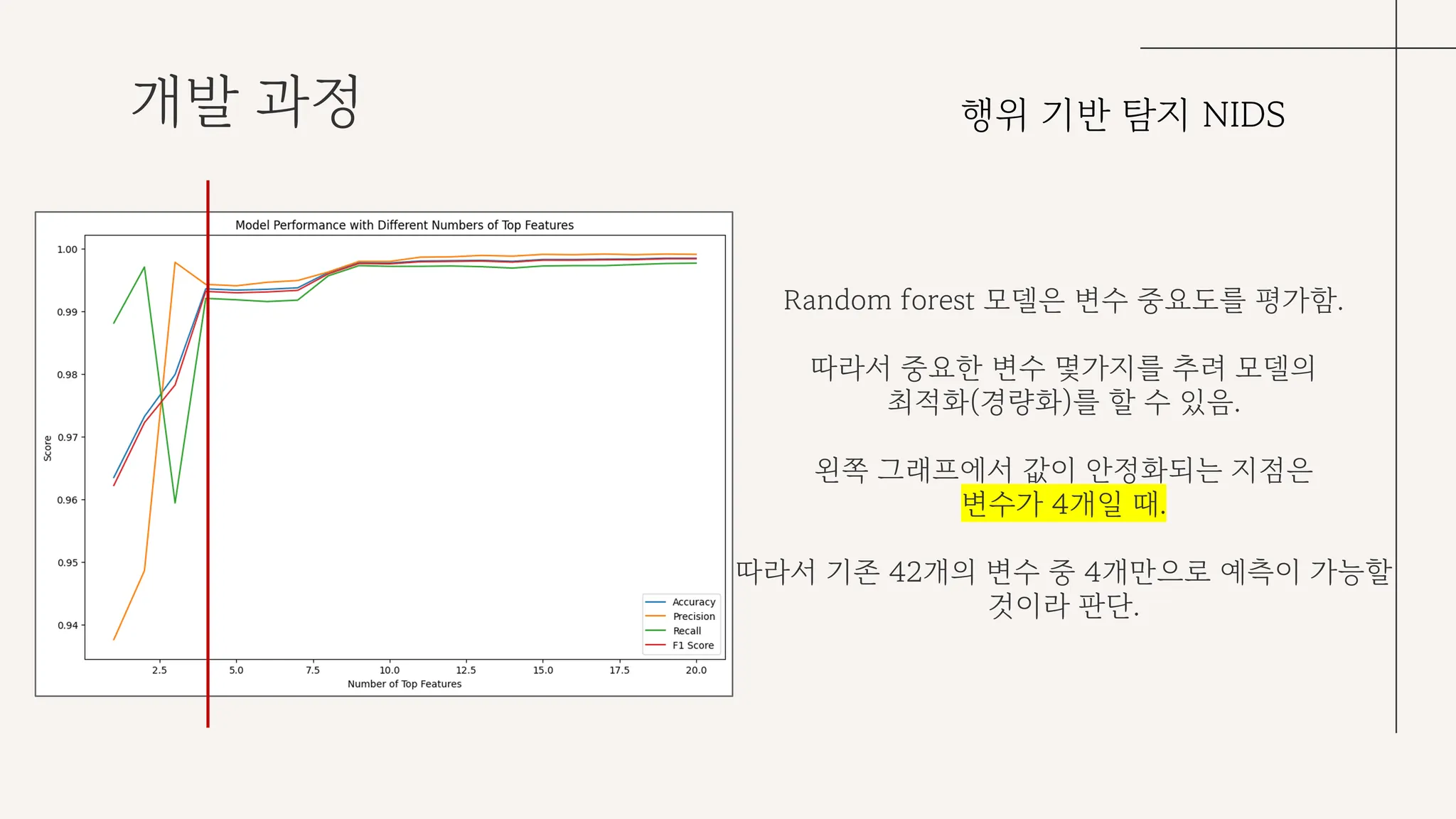랜덤 포레스트 모델은 변수 중요도를 평가할 수 있다. NSL-KDD 데이터셋의 경우 변수가 42개 존재했는데, 해당 변수들을 모두 파싱하여 의미있는 데이터를 찾아내기엔 프로젝트 기간 상의 문제가 있어 최대한 변수를 줄여보고자 했다. 랜덤 포레스트 알고리즘의 변수 중요도가 높은 순서대로 1개 ~ 20개의 변수를 순서대로 늘려가며 성능을 테스트한 결과, 총 4개의 변수만으로 높은 성능을 보여 학습에는 4개의 변수만을 사용하기로 결정했다.