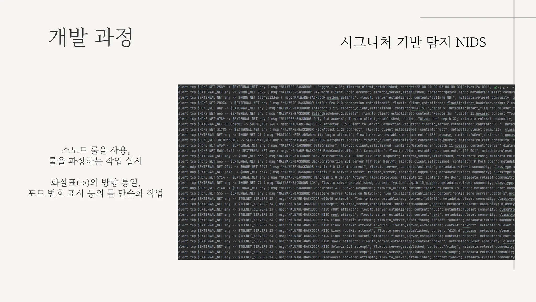 스노트 룰을 활용하여 직접 룰을 파싱하는 작업을 수행했다. 그 과정에서 화살표의 방향을 통일하고, 포트 번호를 표시되게 하는 등의 룰 단순화 작업을 실시했다.