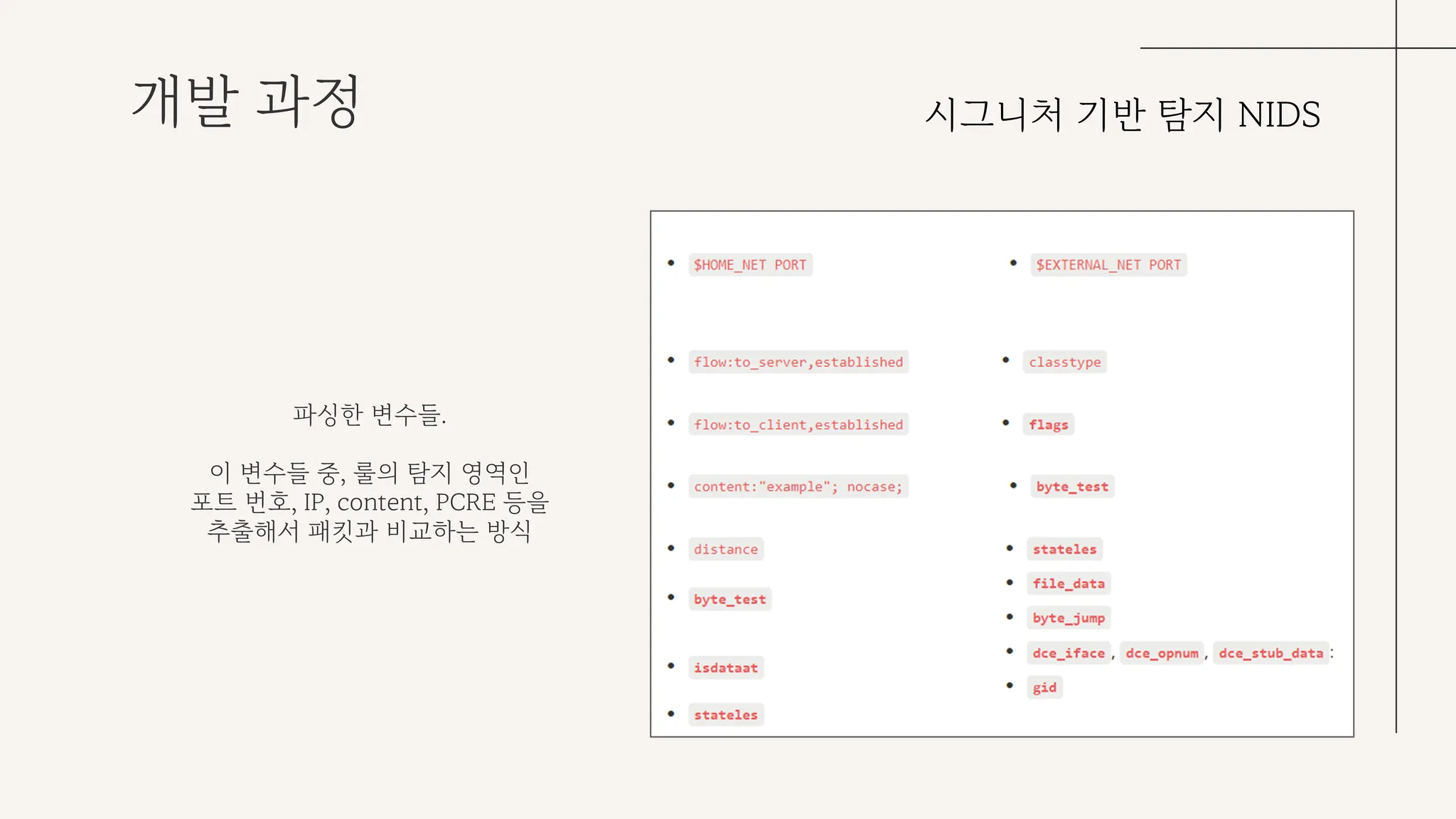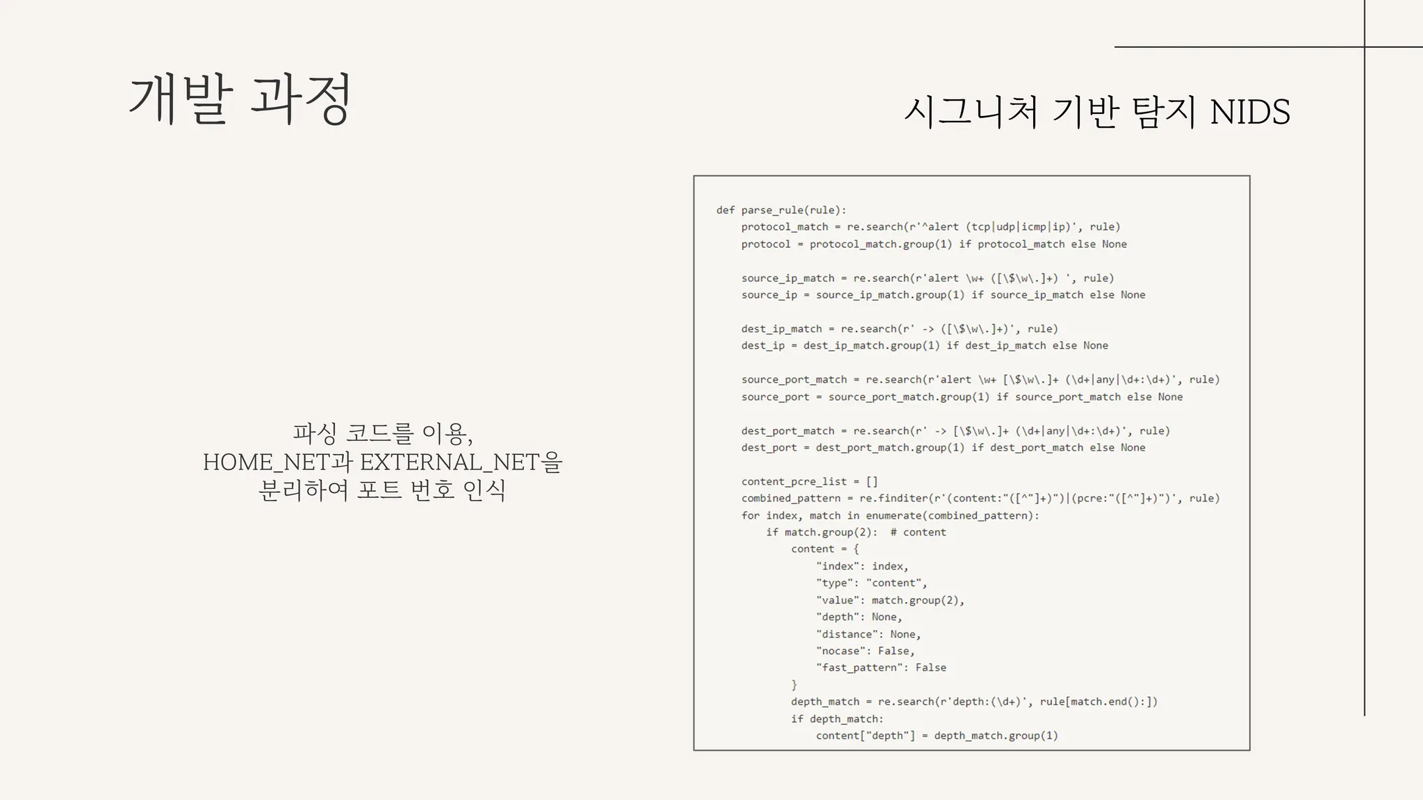 시그니처 기반 탐지 NIDS 개발의 경우, 스노트룰을 직접 파싱하여 시그니처 DB를 구축하고 해당 성능을 검증할 수 있도록 했다.