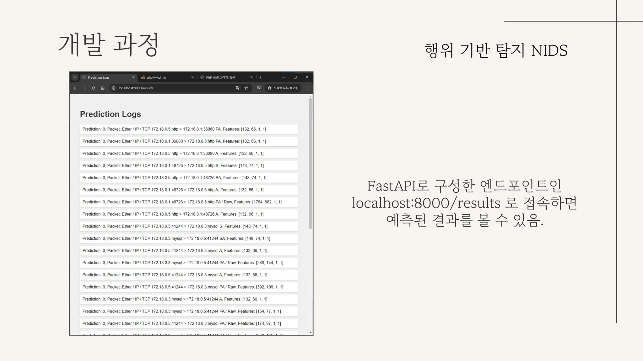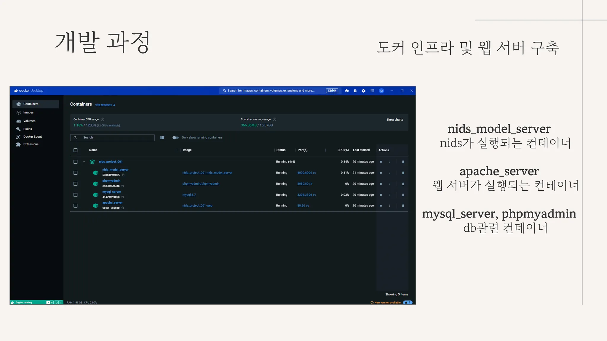 도커 네트워크 구성으로는 nids_model_server, apache_server, mysql_server, phpmyadmin 총 4개의 컨테이너가 존재한다.