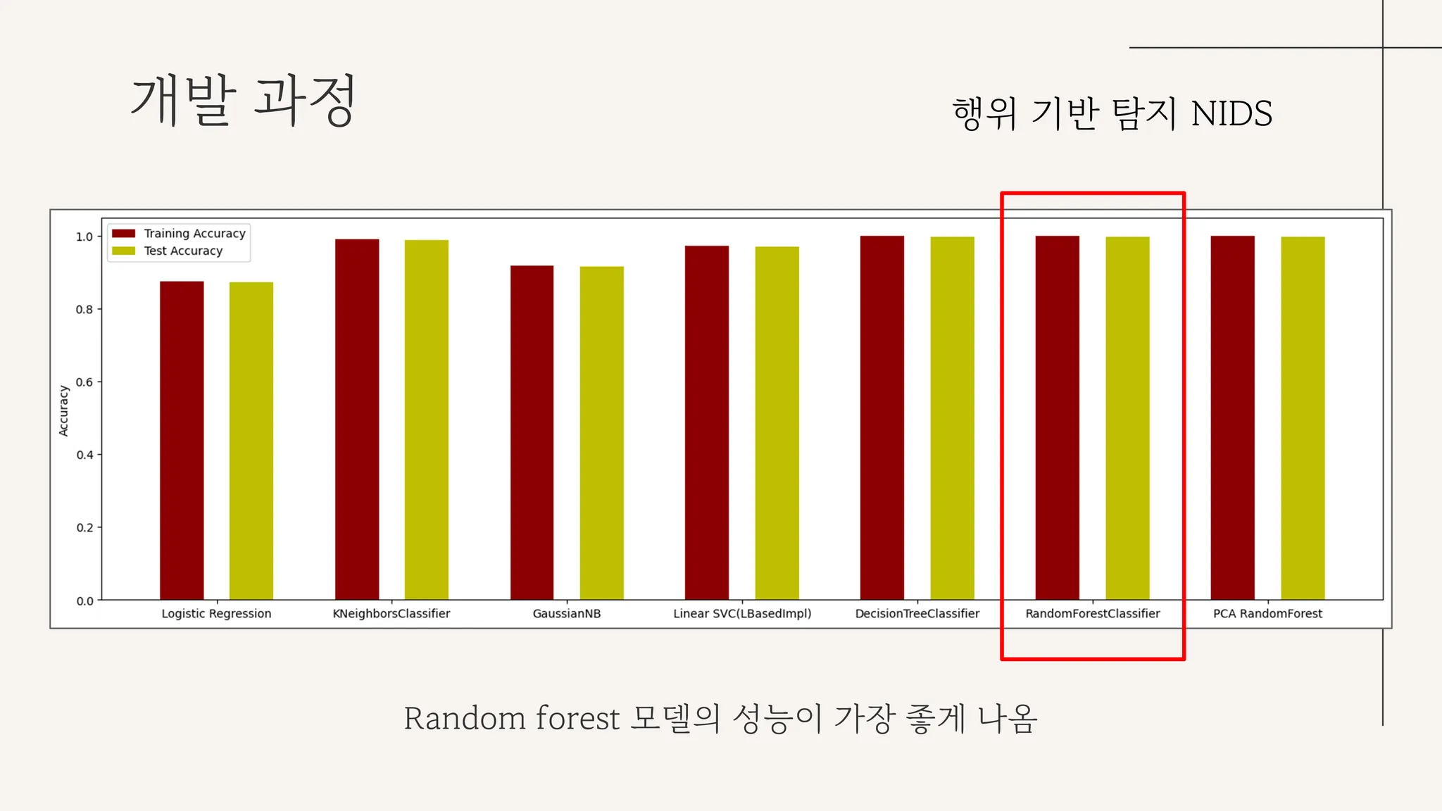 미묘하지만 랜덤 포레스트 알고리즘의 성능이 가장 높게 나와 해당 알고리즘을 채택했다.