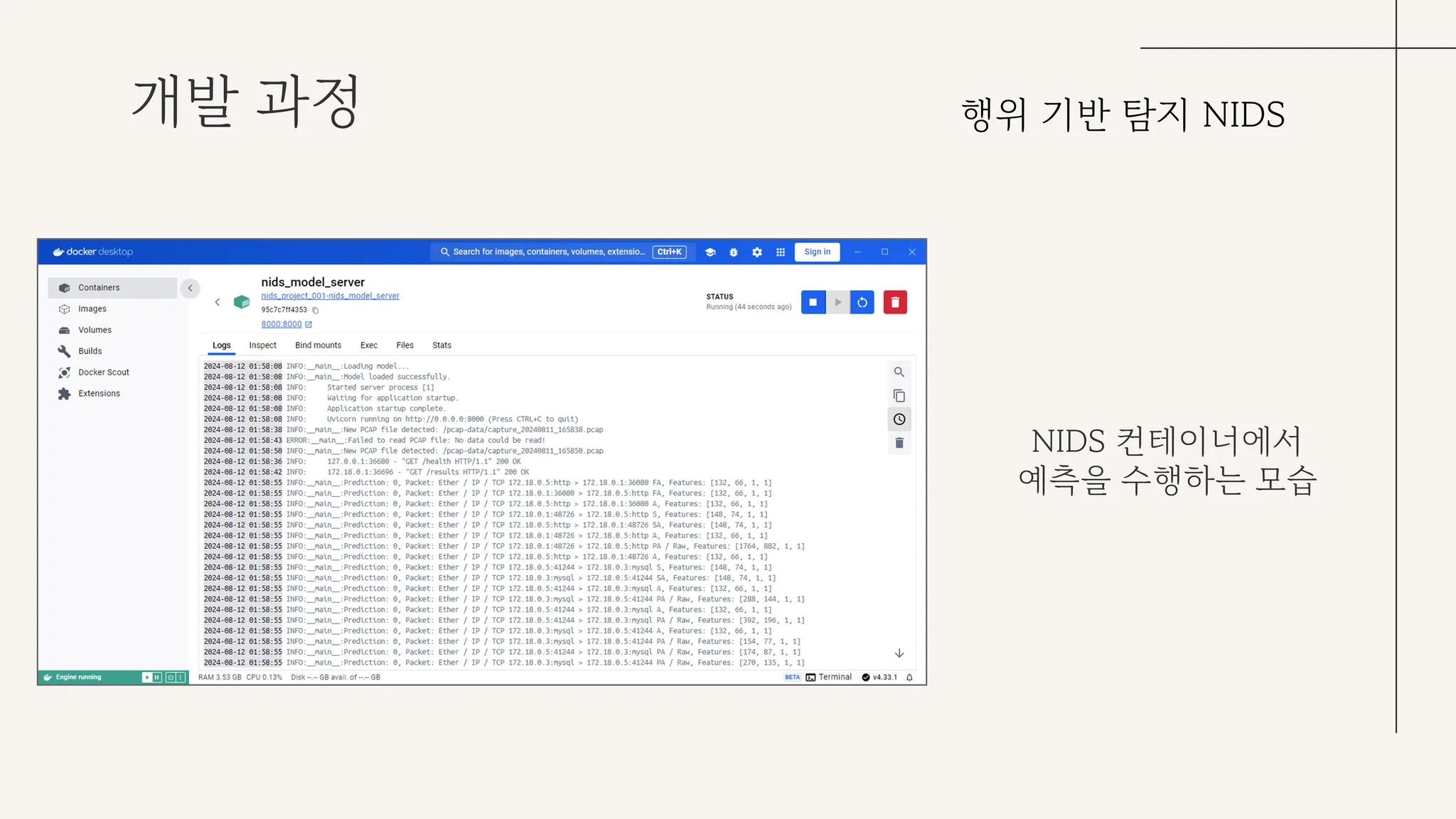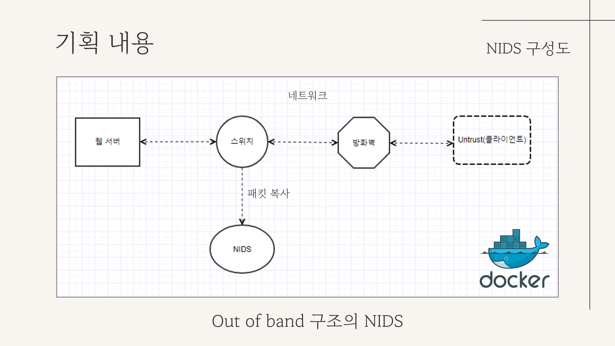 우리의 NIDS는 Out of band 구조로, NIDS가 주시하는 도메인 서버의 부하를 최대한 줄이고자 했다. 이 과정에서 최근 떠오르는 프로세스 격리 기반 컨테이너 가상화 플랫폼인 docker를 활용하여 웹 서버 구축 및 NIDS 모델 서버를 구축하는 네트워크 인프라를 구성했다.