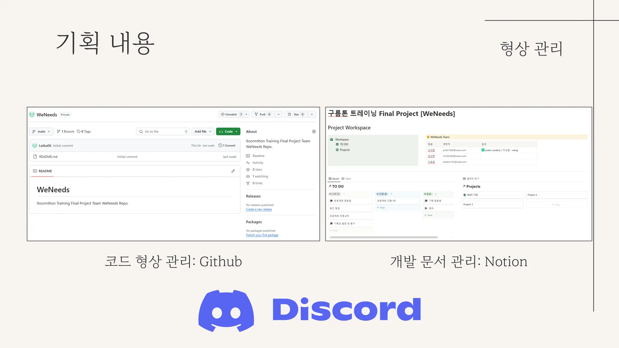 코드 형상 관리의 경우 깃허브를 활용했고, 개발 문서는 노션에 정리, 일반적인 소통의 경우 디스코드 채널을 활용했다.