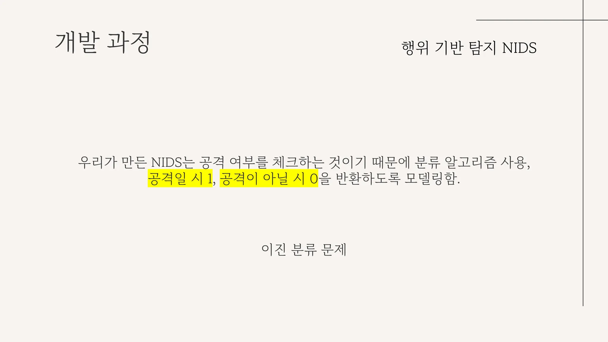 NIDS 개발 과정에서 모든 공격 유형을 반환할 수 있도록 구성하려 했지만, 프로젝트 시간 상의 문제로 공격일 시 1, 공격이 아닌 정상 트래픽일 시 0을 반환하도록 이진 클래스 분류 문제로 변경했다.