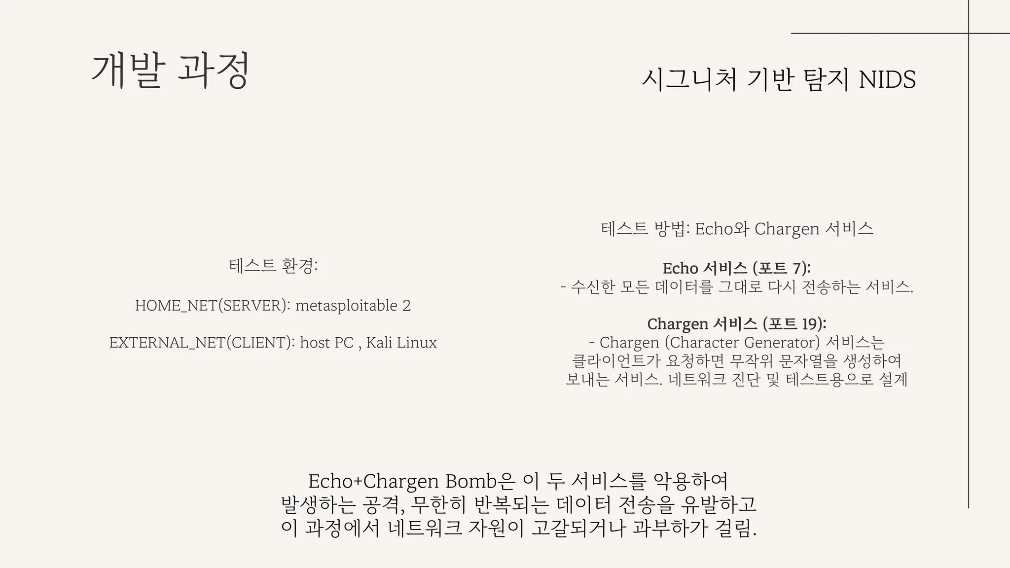 테스트의 경우, 피해자 서버는 metasploitable 2를 활용했고, 공격자 서버는 host PC의 칼리 리눅스를 활용했다. Echo Chargen bomb으로 해당 룰셋이 공격을 잘 테스트하는 지 판단했다.