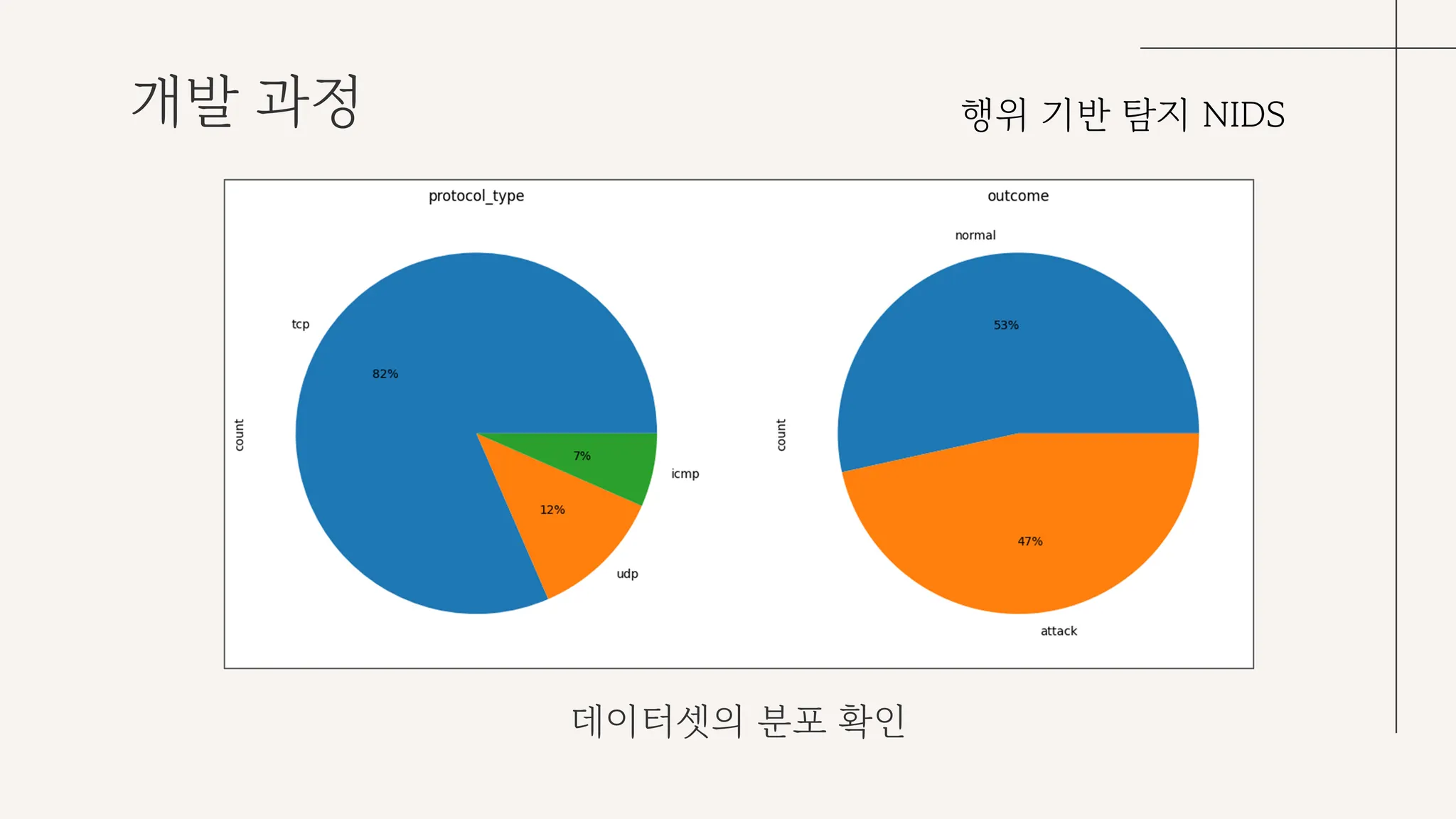 데이터셋의 분포를 확인해보니, protocol_type의 경우 tcp가 82%로 상당수를 차지했고, 공격 트래픽의 경우 47%를 자치해 클래스 불균형 문제는 일어나지 않을 것이라 판단했다.