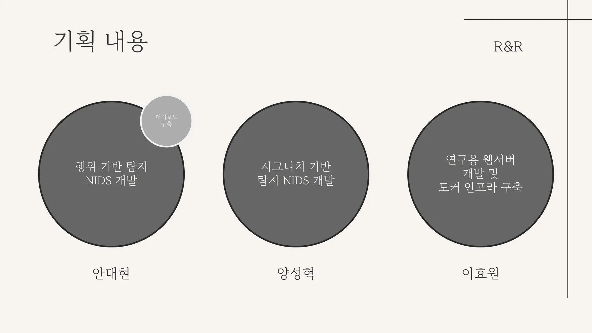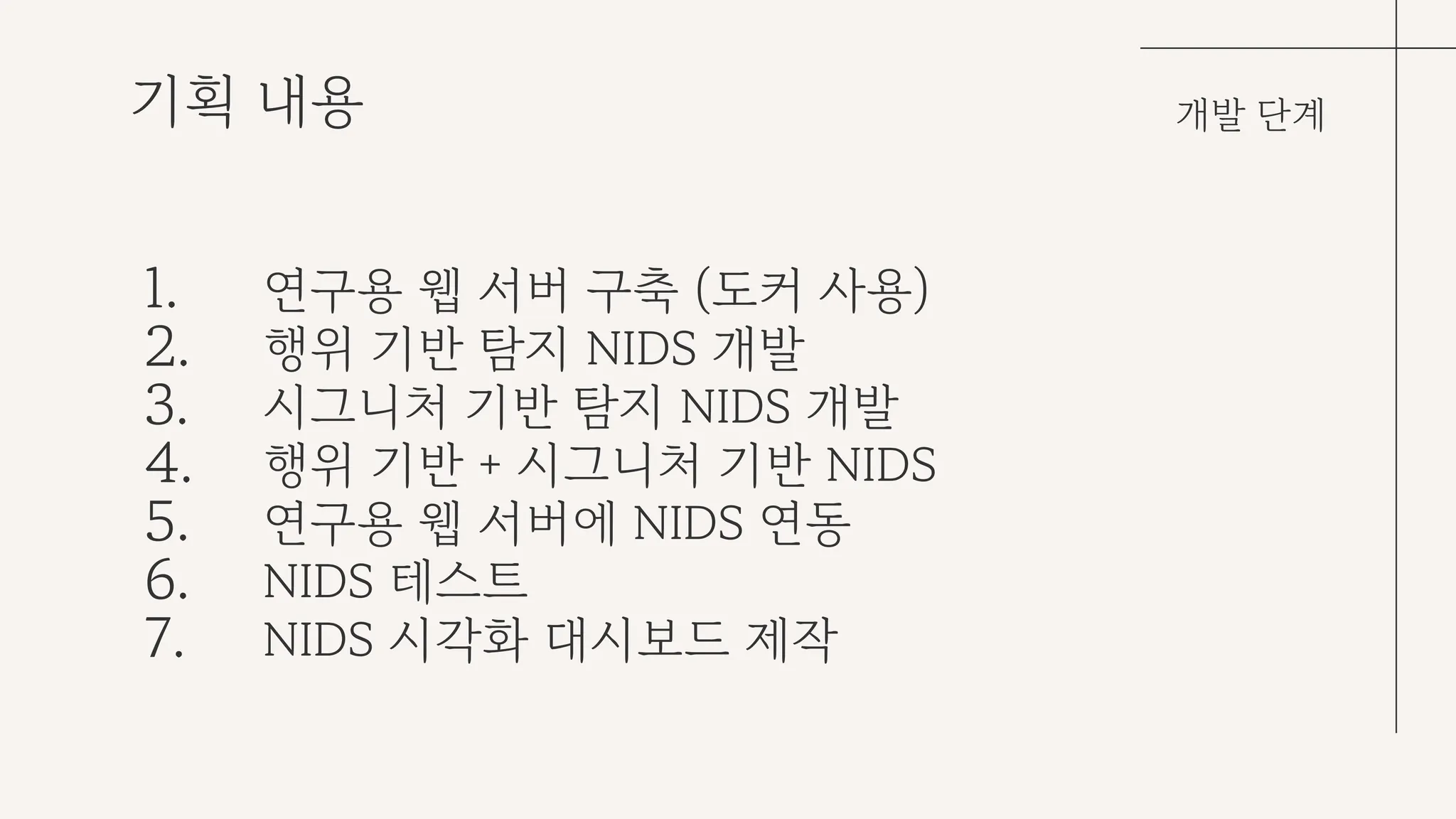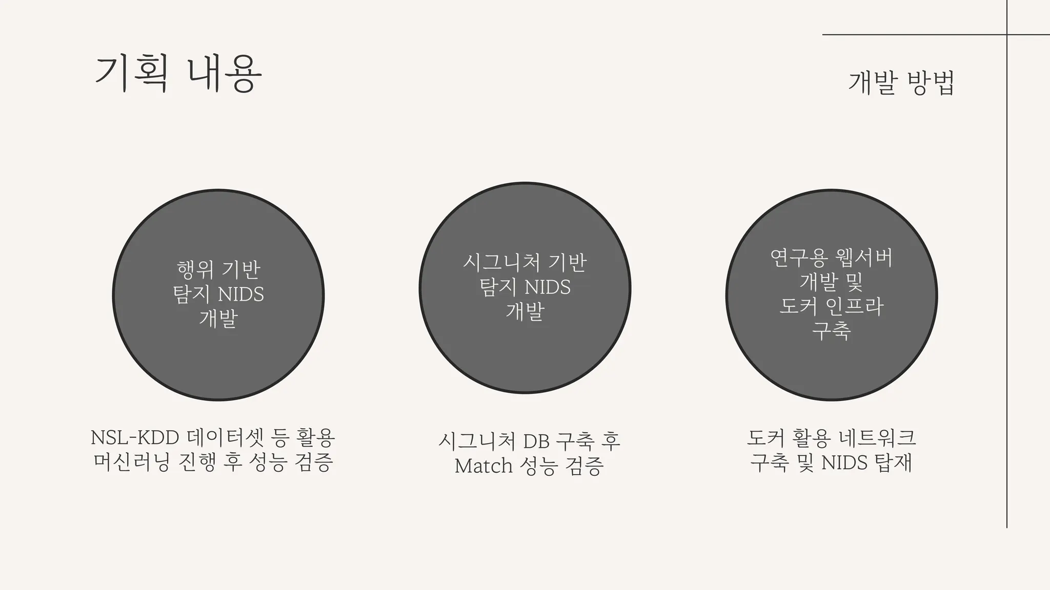 역할 분담의 경우, 행위 기반 탐지 NIDS 개발, 시그니처 기반 탐지 NIDS 개발, 이외 네트워크 인프라 구성 및 테스트용 웹 서버 구축으로 나누었다.